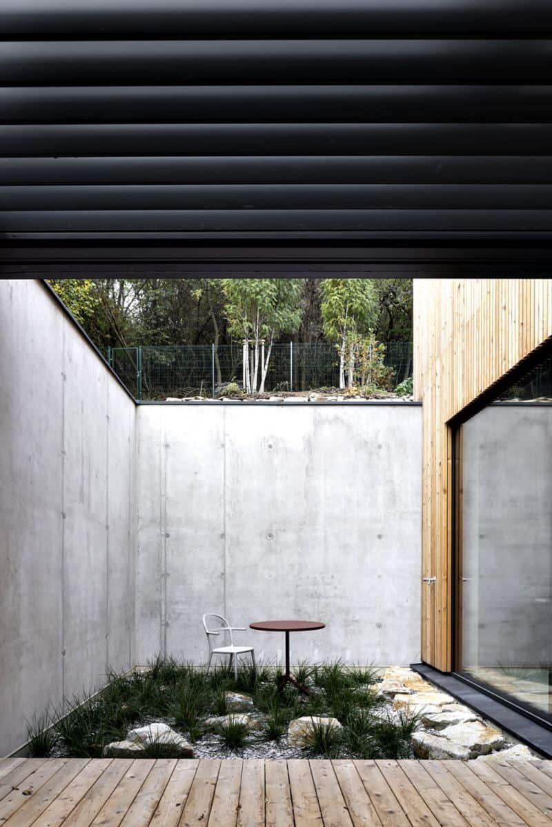 „Cílem návrhu byl dům, který bude svým hmotově-kompozičním řešením i vzhledem odrážet okolní přírodní ráz a plynule zapadne do svého prostředí,“ říká na úvod jeho autor architekt Marian Gombarček. „Architektura je charakteristická přiznáním své materiality, přiznané betonové a dřevěné konstrukce přecházejí z exteriéru do interiéru, vytvářejí jasnou hmotovou kompozici stavby a také kontinuitu, která je zachována i v průhledech uvnitř domu v různých směrech.“