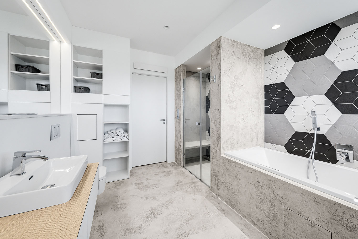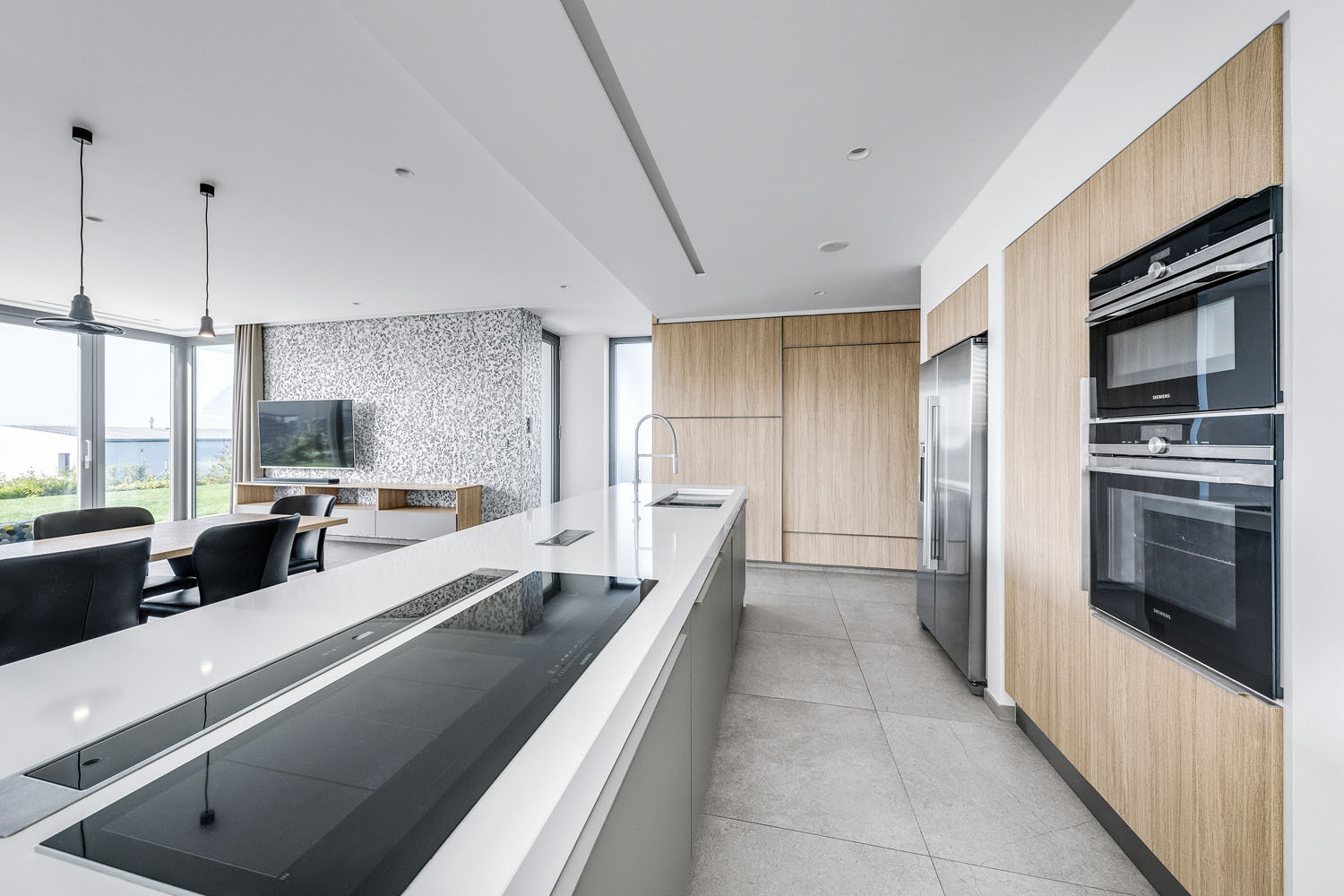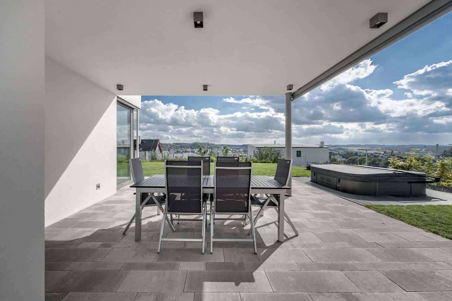 ▪ Okna a vstupní dveře: okenní systémy Schüco AWS 75. SI, vysoce tepelně izolovaný systém posuvných dveří se zdvihem Schüco ASS 70. HI, vstupní dveře Schüco ADS 75 HD. HI, předokenní žaluzie.