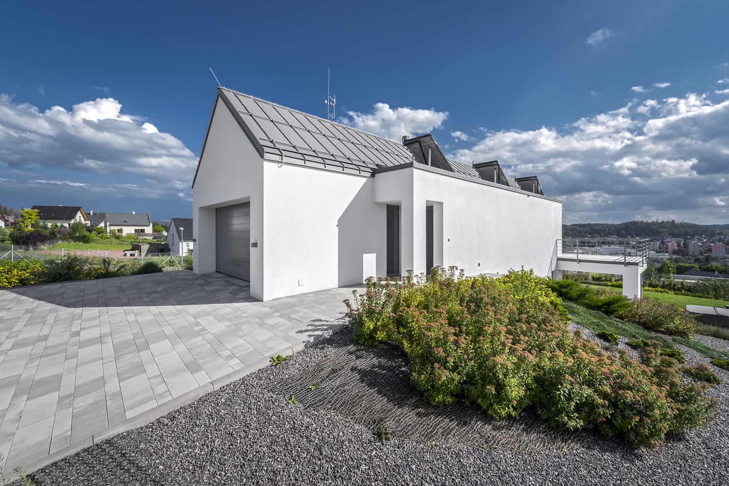 Architekti se museli na jižně orientovaném pozemku s přístupem ze severu popasovat s třímetrovým výškovým rozdílem. „Nejsme přívrženci remodelace, která vyžaduje přemístění mnoha tun zeminy. Děláme jen drobné úpravy v okolí domu, například u terasy,“ říká Michal Rosa. „Úkolem architekta je vymyslet dům, který respektuje okolní krajinu, nikoli ji přizpůsobovat projektu.“