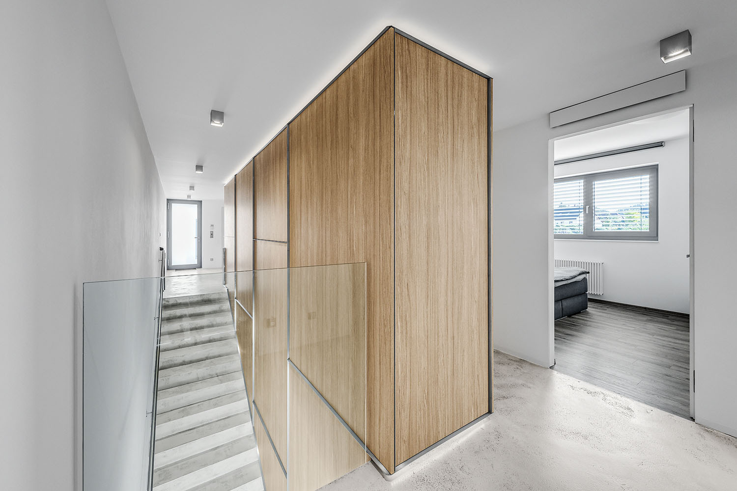 I v tomto případě tradiční požadavek stavebníků na dostatek úložných prostor naplnili měrou vrchovatou. Kromě již zmíněného prostoru pro sportovní vybavení v rámci garáže a samostatné šatny upoutá pozornost především linie skříní lemující schodiště, která plní zároveň funkci schodišťového „zábradlí“. Další úložné prostory nabízí kuchyň s vysokými skříněmi vestavěnými do niky, americkou lednicí a varným ostrůvkem. Na kuchyňskou stěnu s vestavnými spotřebiči navazuje spíž.