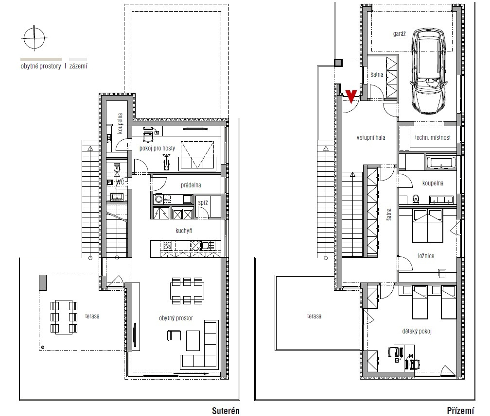 Zatímco většina domů mívá garáž i vstup v přízemí a po schodech se stoupá do ložnicového patra, zde je tomu přesně naopak. Do domu se vstupuje ze severu v nejvyšším bodě pozemku, kde se nachází i garáž s prostorem pro umístění sportovního vybavení a technická místnost. Na prostornou vstupní halu navazuje šatna. Do společné obývací části se sestupuje po přímém schodišti, které ze svých spodních stupňů nabízí průhled do zahrady.