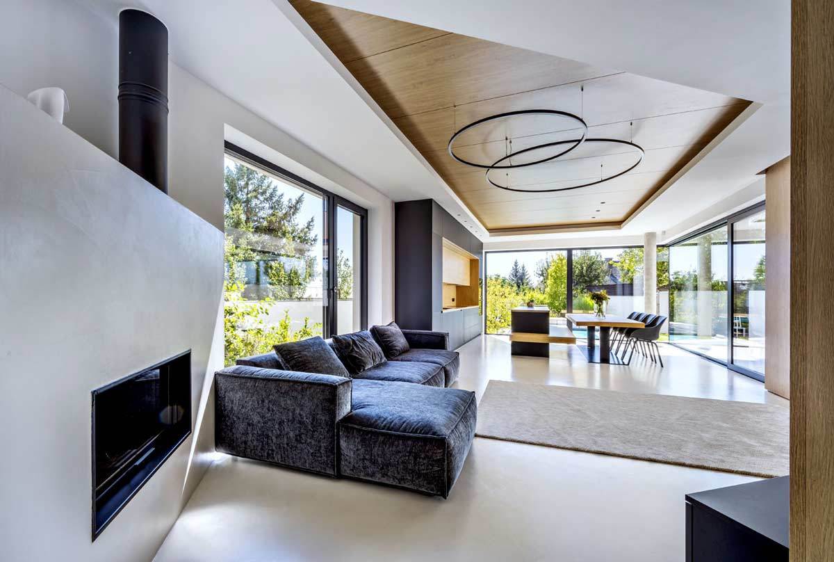 Stavba, která na fotografiích působí dojmem velkorysé rezidence, je ve skutečnosti středně velký rodinný dům. Díky mistrnému architektonickému řešení tu však mají majitelé veškerý moderní komfort i dostatek prostoru, a jak sami říkají, není tu místo, které by nevyužili.