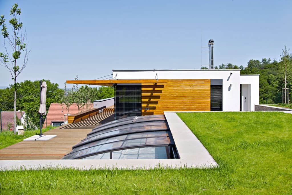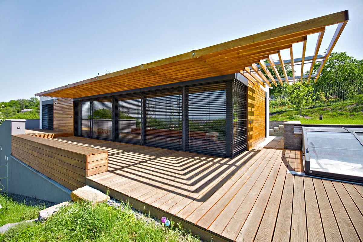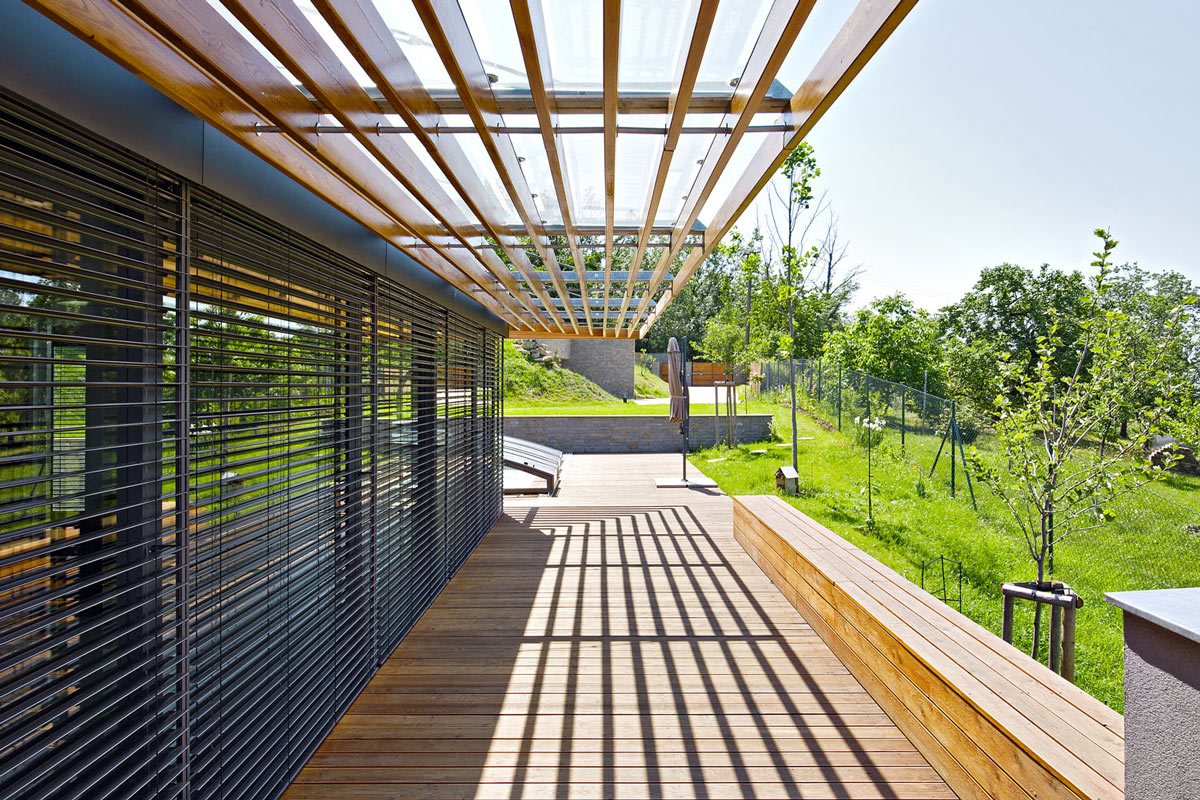 Vlastní rodinný dům byl postaven ve výše položené části pozemku, na rozhraní náhorní plošiny a prudkého severního svahu, a využívá tak maximum toto, co parcela nabízí – panoramatický výhled a intenzivní oslunění.