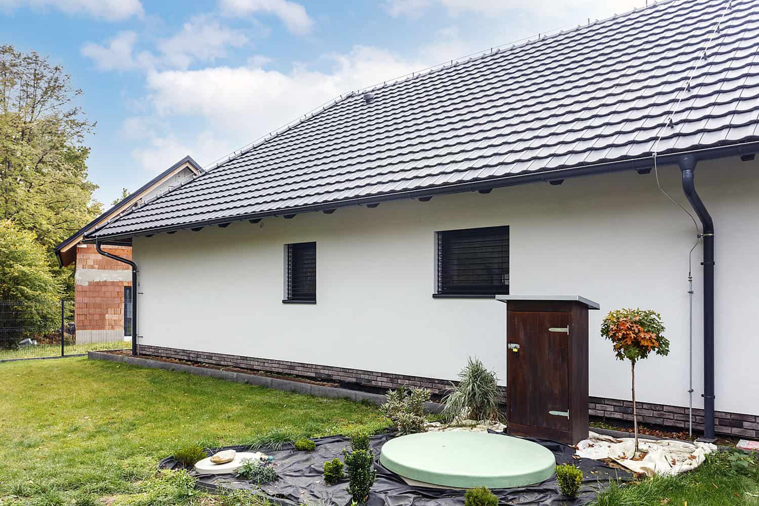 Dům je napojen na vodovodní řad a má vlastní čističku odpadních vod. Z čističky voda pokračuje přes přepad do jímky, kde se shromažďuje užitková voda a odtud dalším přepadem pokračuje do další jímky zakončené vsakem. Do vsakovací jímky je kromě čištěné vody svedena i dešťová voda ze střech. Ta se používá k zavlažování, na zahradě je umístěno v zemi šest zásuvek Gardena, do kterých je možné zapojit hadici pro zálivku.