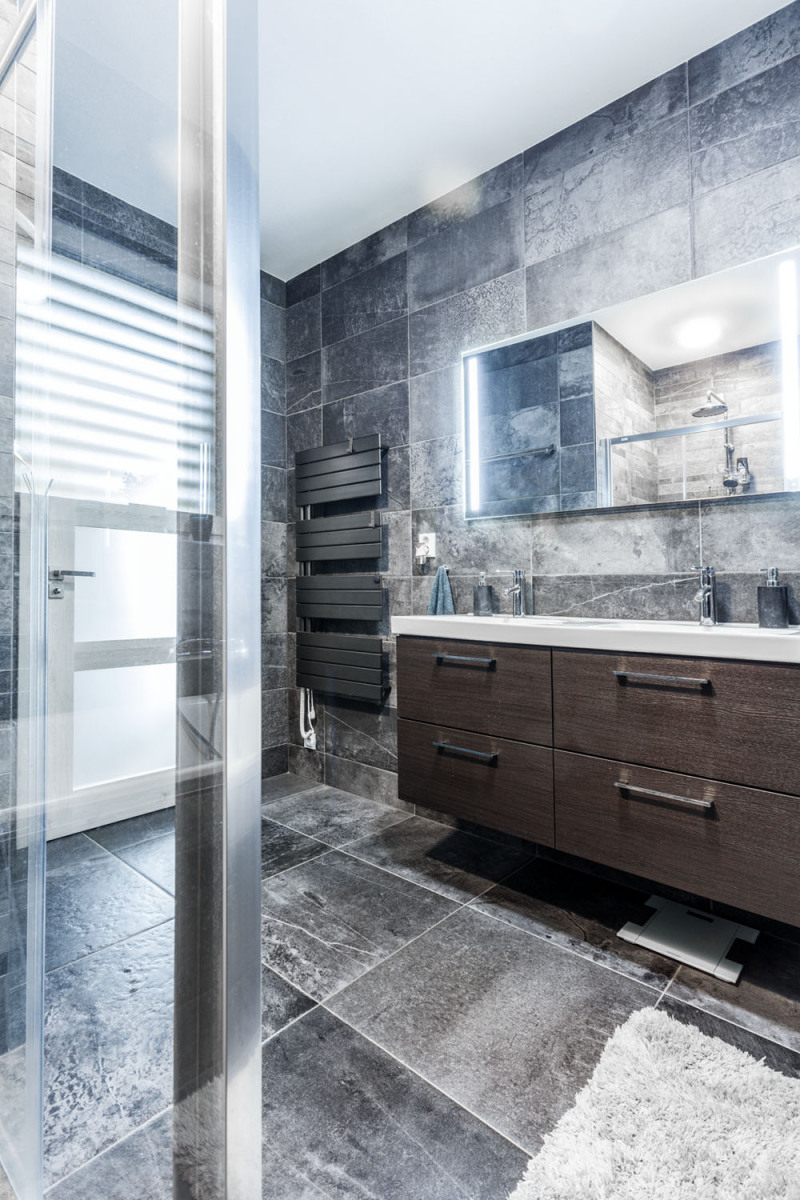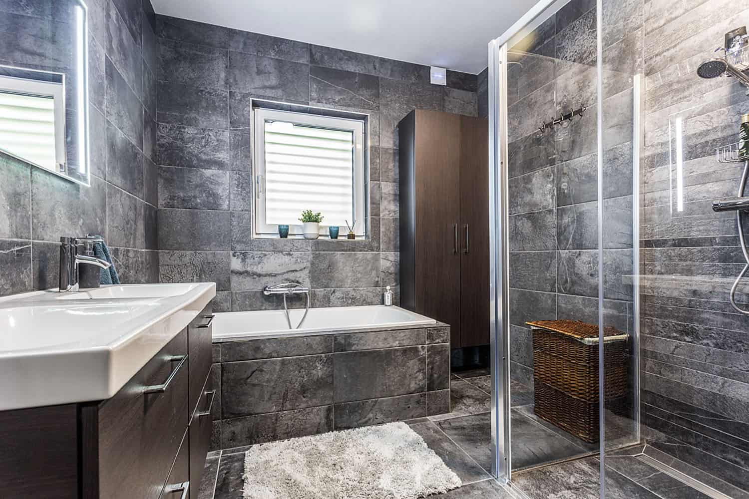 ▪ Konstrukce: obvodové zdivo Porotherm 38 T Profi, příčky tloušťky 24, 11,5 a 14 cm broušené, keramický strop – Miaco vložky a nosníky Porotherm, krbová vložka Romotop, komín Schiedel UNI Advancet, dřevěný krov, střešní krytina Tondach Stodo engoba černá.
