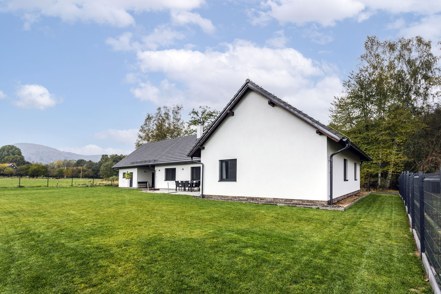 Parcela by byla, ale scházel dům. „Dal jsem manželce několik typových projektů, aby si vybrala, co by se jí líbilo. Ale protože jsem stavař, nakreslil jsem si sám půdorys domu podle svých představ. Zajímavé bylo, že manželka si vybrala dům, který se prakticky podobal domu, který jsem nakreslil. Takže se naše představy potkaly – nezávisle na sobě jsme chtěli bungalov do L, s velkým obývákem. Já navíc k domu navrhl kryté garážové stání a garáž. Postupně jsme vyměnili čtyři projektanty, než jsme se dostali do finále, protože se komunikace s nimi velmi vlekla. Na výsledné podobě domu se logicky podepsaly i místní regulativy platné pro CHKO. Nejzásadnější byl sklon střechy 38%, který jsme museli dodržet.“