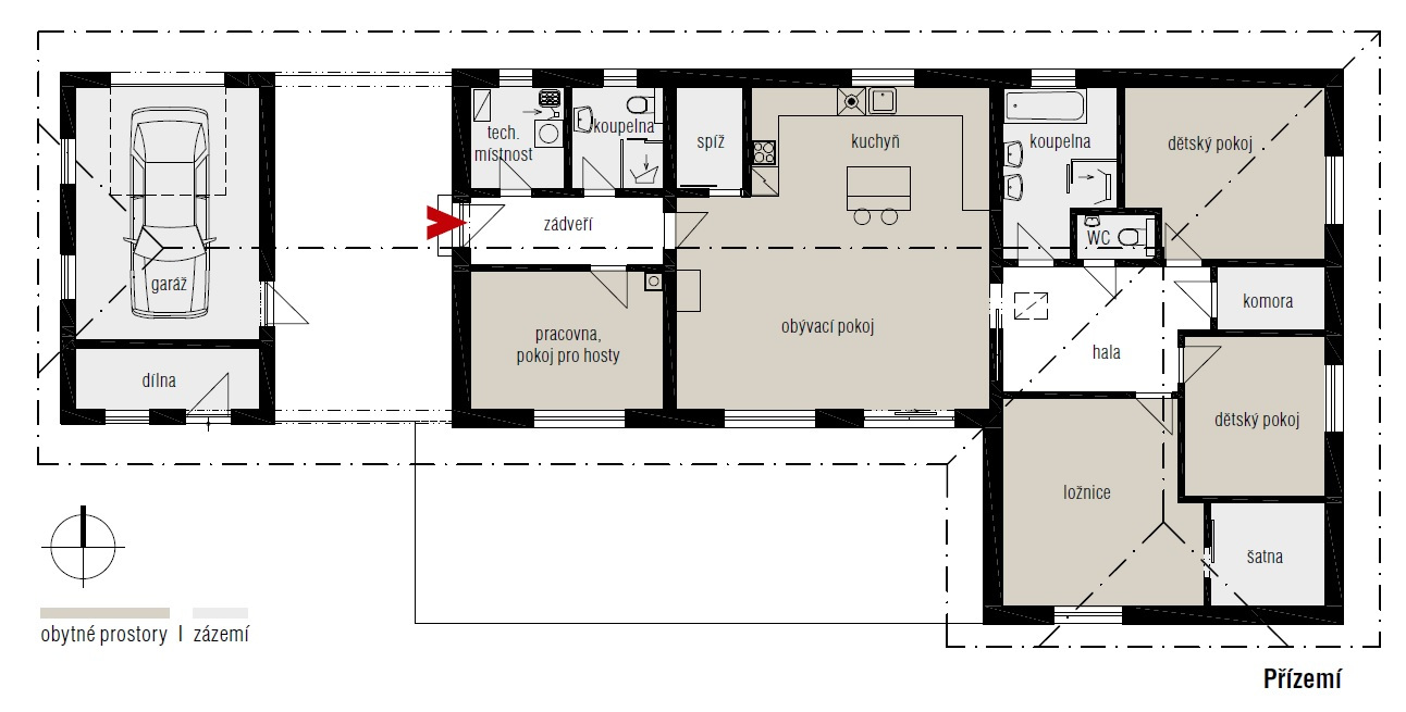 V pravé části domu se nachází dlouhá garáž s dílnou, mezi garáží a domem je zastřešená proluka – garážové stání, v levé části je vlastní vstup do domu. Z prostoru zádveří ústí dveře do technické místnosti s pračkou, sušičkou, výlevkou, kotlem, bojlerem, vedle je menší koupelna s toaletou, sprchovým koutem a umyvadlem. Naproti technické místnosti najdete dveře do pracovny s pokojem pro hosty. Ze zádveří se vchází do prostorného obýváku s kuchyní a krbovými kamny. Kuchyň je uspořádána do tvaru U a sousedí s velkou spíží. Při postupu dál následuje prostorná hala s dveřmi do hlavní koupelny, samostatné toalety a dětského pokoje. Je tu i zázemí – úklidová komora. Vedle ní se nachází další dětský pokoj a na pravé straně je prostorná hlavní ložnice se šatnou.