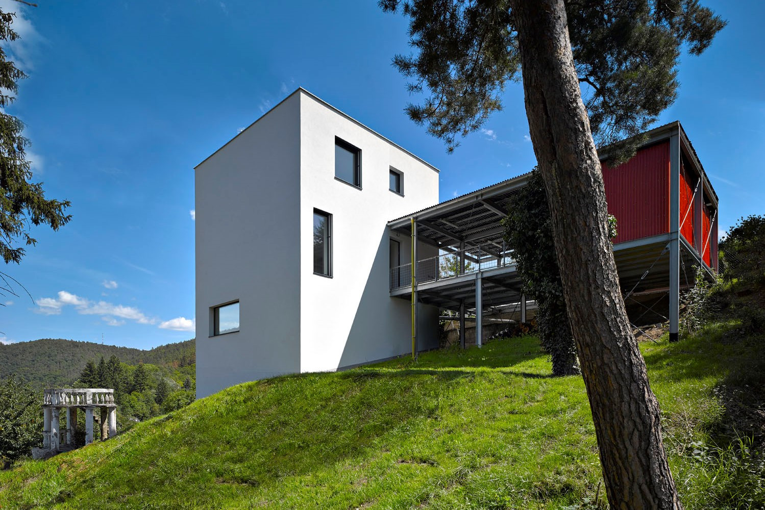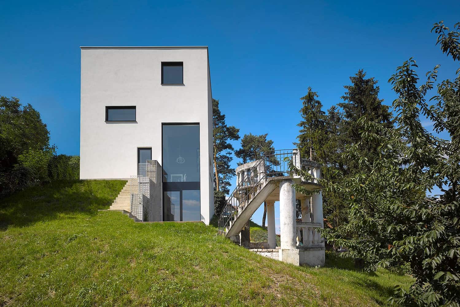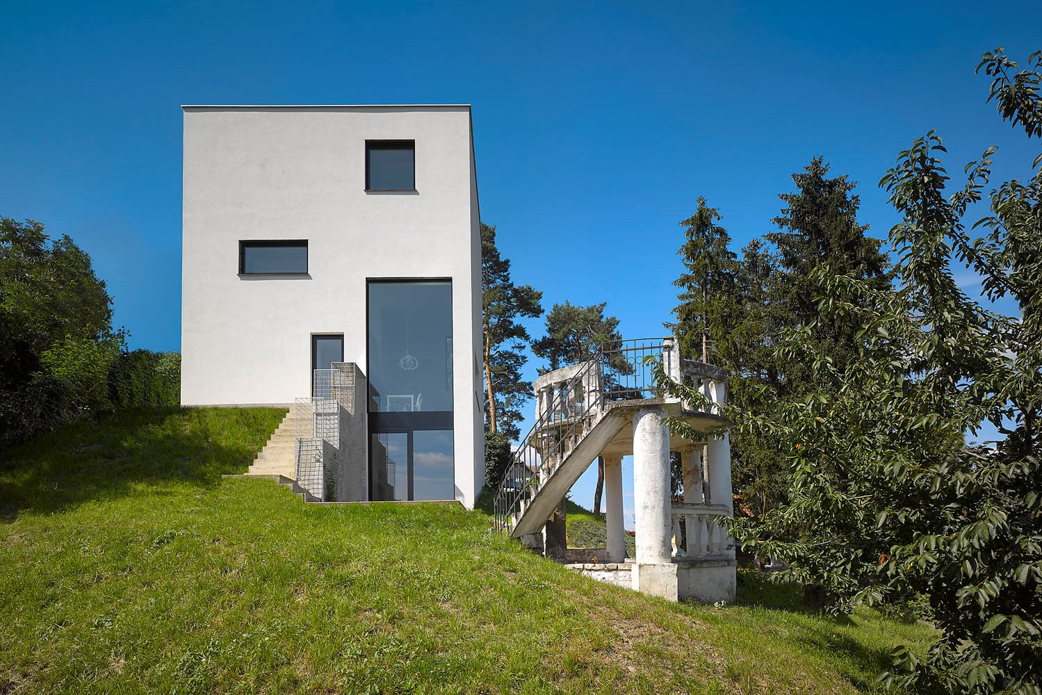 Ve Všenorech u Prahy tehdy byla na prodej parcela, která původně tvořila horní část zahrady u starší vily. Všechny dosavadní zájemce odradily strmý svah a špatný přístup. Ale měla i své výhody: dobrou cenu a jedinečné výhledy do údolí Berounky, na okolní kopce i na Prahu. A také sousedství krásné, byť zchátralé prvorepublikové stavby, jejíž duch působí na celkovou atmosféru místa. Na zakoupeném pozemku zanechává „stopu“ v podobě altánku s motivy klasické antické architektury.