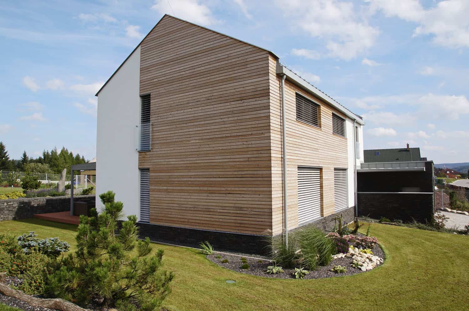 Bydlení v rodinném domě si budoucí investoři nejprve vyzkoušeli v pronájmu o pouhé dvě ulice níž pod současným domovem. Ten vyrostl na stavební parcele situované do nové zástavby nad okresním městem. Vysněný dům měl mít jednoduchý tvar a rovnou střechu, místní stavební regulativa však uskutečnění tohoto přání nakloněna nebyla. Investoři se smířili se sedlovou střechou se sklonem pouze 25°, která uzavírá stavbu v čistě pravoúhlých liniích. Ploché střechy se ale úplně nevzdali, dokonce jich mají hned několik. Je jí uzavřena jak kostka přistavěné garáže, která je součástí typového rodinného domu Iveta z projektového ateliéru Thermo Plus, tak i druhá kostka ukrývající fotografický ateliér, jímž na přání investorů Ing. Karel Peterka svůj projekt doplnil.