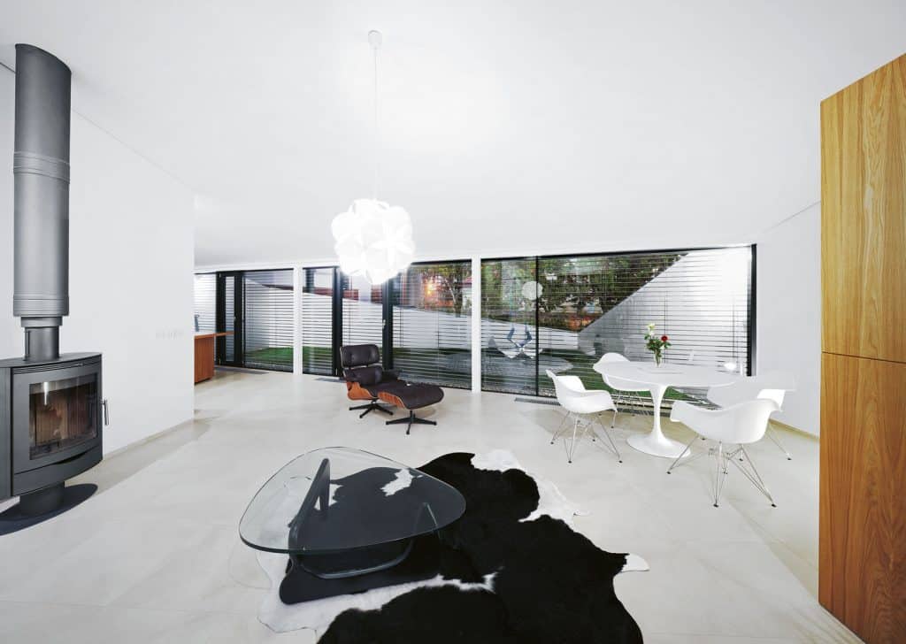 Interiér je prozářen světlem, které přichází prosklenou stěnou a odráží se od bílých stěn a světlé kamenné podlahy. Moderní vybavení navržené na míru se omezuje na nejnutnější nábytek a je doplněno několika exkluzivními solitéry vybranými v souladu s celkovým konceptem domu. Jak křeslo od Charlese Eamese, tak legendární plastové židle značky Vitra reprezentují úspornost, nadčasovou kvalitu a maximálně promyšlené řešení, tedy principy charakterizující celou stavbu.