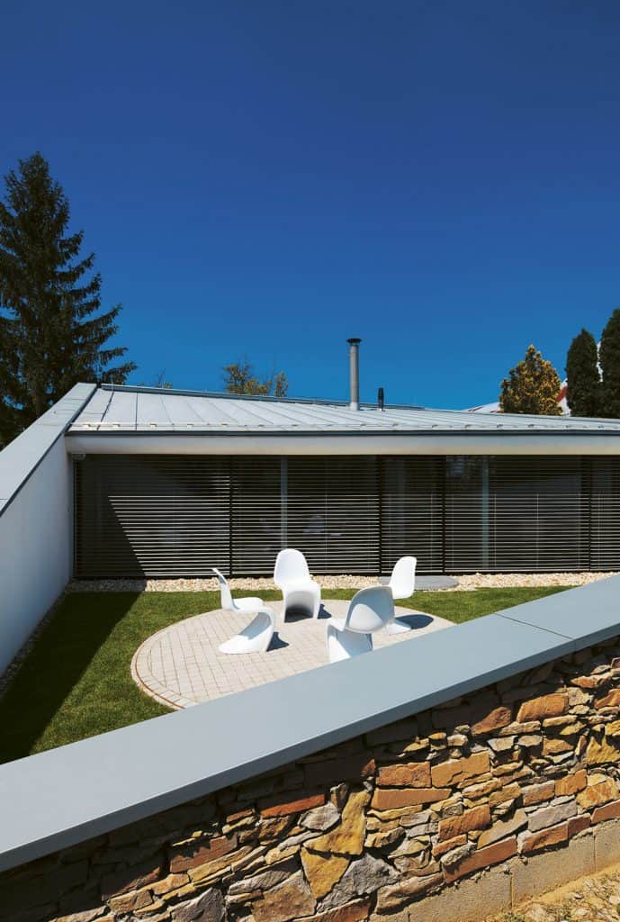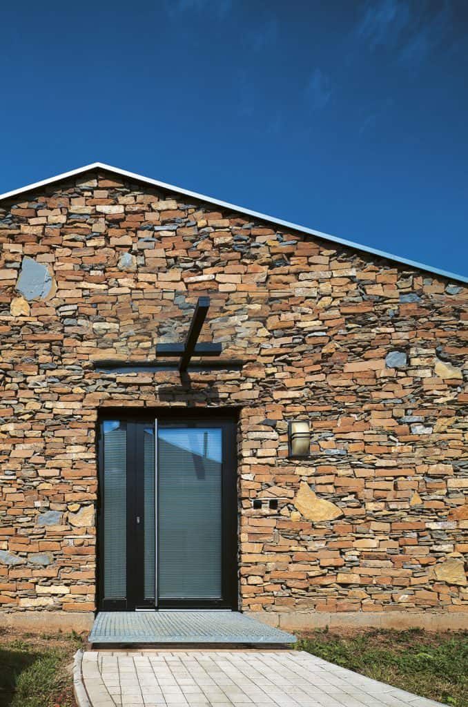 Přízemní dům je uzavřený v kompaktním obdélníku obklopeném čtyřmi kamennými stěnami a zastřešeném nízkou asymetrickou sedlovou střechou. Zvenku trochu připomíná kamenný monument, zdivo z materiálu, který je sám o sobě symbolem trvanlivosti a nadčasovosti, je navíc komponováno jako zídka zděná na sucho a budí dojem, že už tu stojí možná staletí. Detaily zpracování jsou však zcela současné.