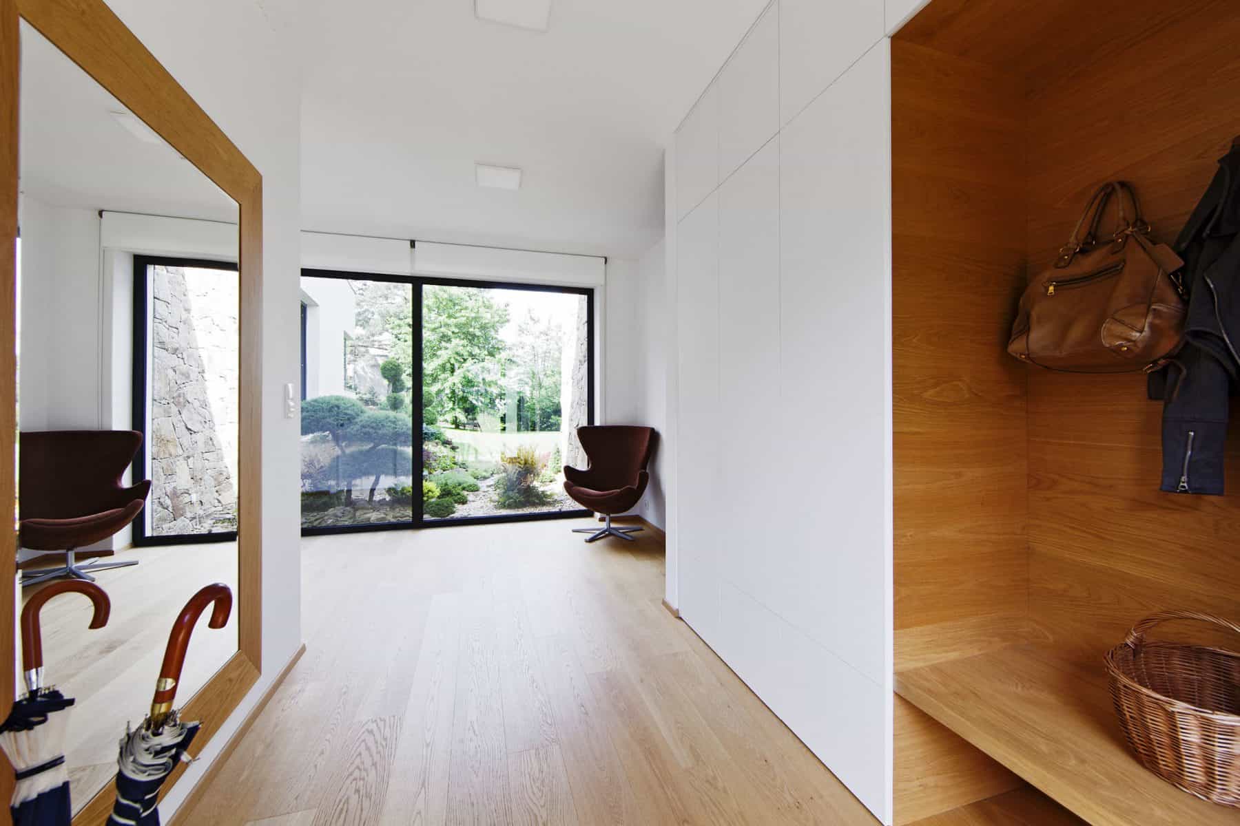 Pozemek ve svahu ve starší vilové čtvrti je sám o sobě malý zázrak – parcela nabízí kouzelný výhled na jeden z našich nejromantičtějších zámků a přitom sem není ze sousedních komunikací prakticky odnikud vidět. Jedinečná poloha se logicky stala určujícím faktorem architektonického řešení domu.