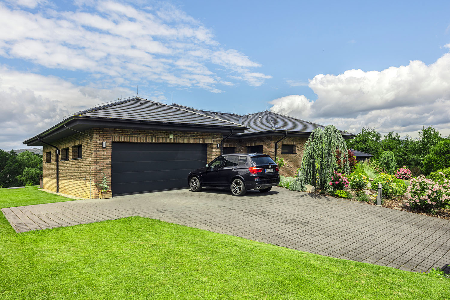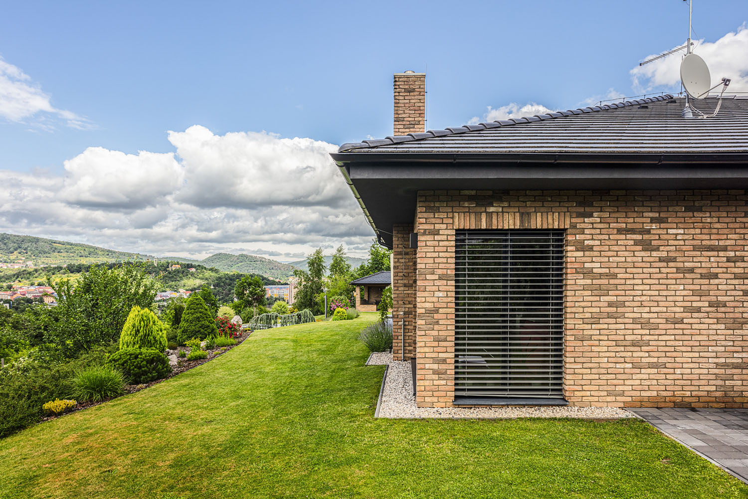 Exteriér koresponduje s interiérem – fasáda je obložena pečlivě provedeným cihelným páskovým obkladem s raženou strukturou, dům má odolnou betonovou krytinu v decentním antracitovém odstínu a dřevěné okenní rámy jsou zvenčí opatřeny hliníkovým pláštěm. Stavba tak nenásilně a přirozeně zapadá do svého prostředí a bude jí to tady slušet i za desítky let.