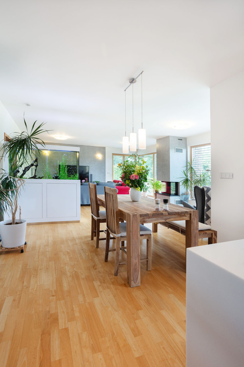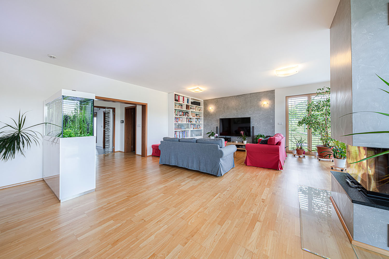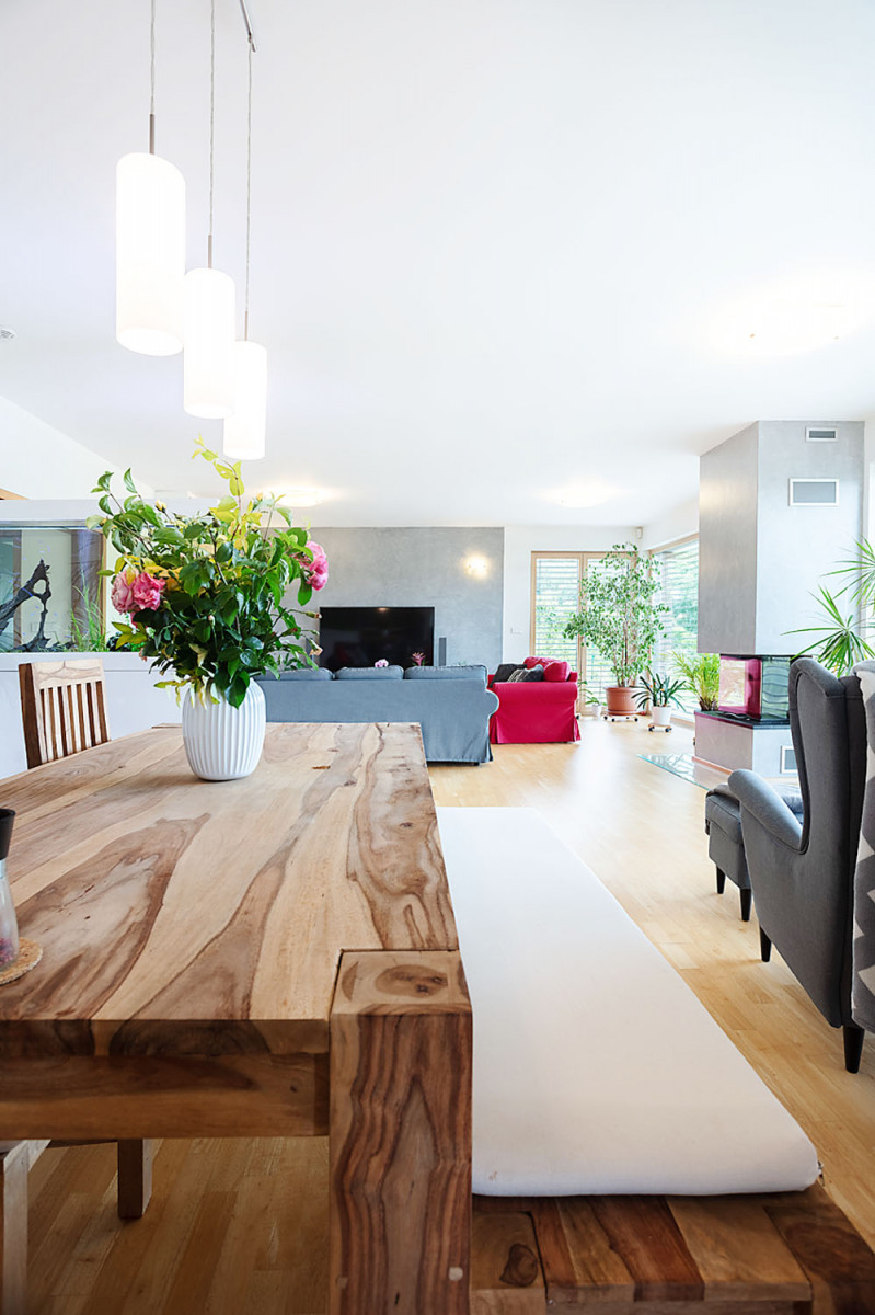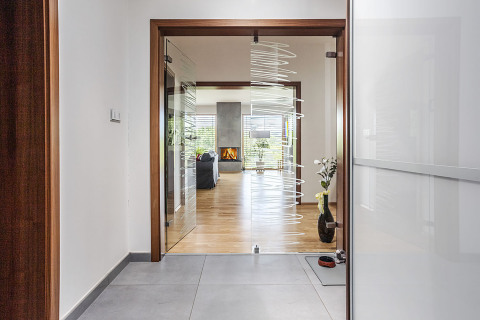 Říká se, že první dojem při vstupu do domu rozhoduje o tom, jak se zde budete cítit. V tomto případě jsme vnímali otevřený, přehledný, světlý a útulný prostor. Z velké předsíně se skleněnými dveřmi prochází do široké chodby, odkud vedou dva volné průchody do bohatě prosklené společné obývací části. Majitelé si dům navrhli tak, aby každá místnost měla okno a aby denní světlo volně procházelo ve všech směrech. Nechybí ani ve střední chodbě, která je osvětlena ze sousedních místností a také shora střešními světlovody.