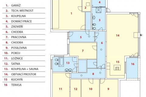 Přízemní dům má půdorys tvaru U rozdělený podélnou chodbou na dvě části. Podél západní strany probíhá velký jednolitý obývací prostor se sezením a kuchyň s jídelnou a výstupem na krytou terasu. Přes prosklenou fasádu je vidět zahrada a celá okolní krajina jako na dlani a slunce sem svítí po celé odpoledne. Směrem k východu je orientována prostorná předsíň, dvougaráž, pracovna a ložnice. Dům má také malé fitness, velkou chloubou jsou dvě prostorné koupelny – jedna relaxační (sprchový kout, vana, dvě umyvadla, WC, bidet a sauna) umístěná v blízkosti ložnice, druhá „provozní“ v denní části domu – s toaletou a velkým sprchovým koutem. Přes tuto koupelnu se vchází do prádelny, kde je umístěna pračka a další vybavení pro domácí práce. Z této koupelny se také dá vyjít ven na malou samostatnou terasu s vířivkou.
