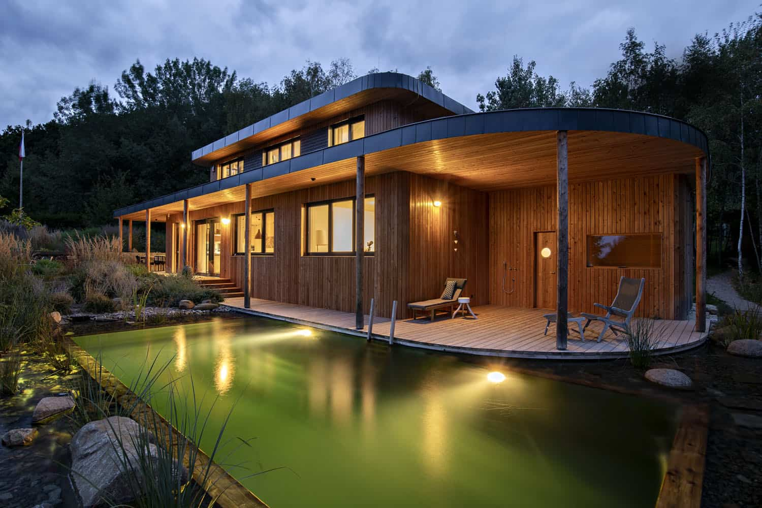Dům obklopený terasou, jezírkem a krásnou zahradou na první pohled upoutá pozornost dřevěnou fasádou a atypickými oblými tvary. Architektonický koncept je založen na dokonalém propojení přírody, pohodlí a tradic staré východní filozofie.