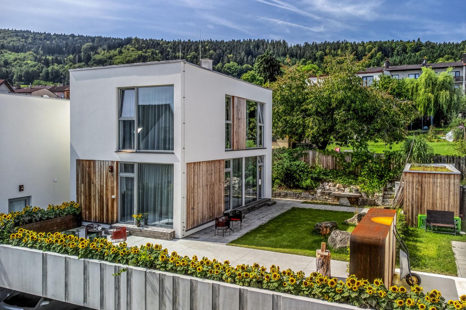 Také architektonický styl domů je jednotný – moderní kompaktní nízkoenergetické dřevostavby s plochými střechami a velkými prosklenými plochami mají hladce omítnuté fasády, některé jsou obloženy modřínovým dřevem. Velká okna směřují především na východ a na jih, a to tak, aby v domech bylo hodně světla, ale vizuální kontakt mezi obytnými jednotkami byl minimální. Každý dům je trochu jiný, a společně vytvářejí harmonický celek, který výborně zapadá do obytné zástavby ze 70. let minulého století. Jeden z nich jsme měli možnost navštívit.