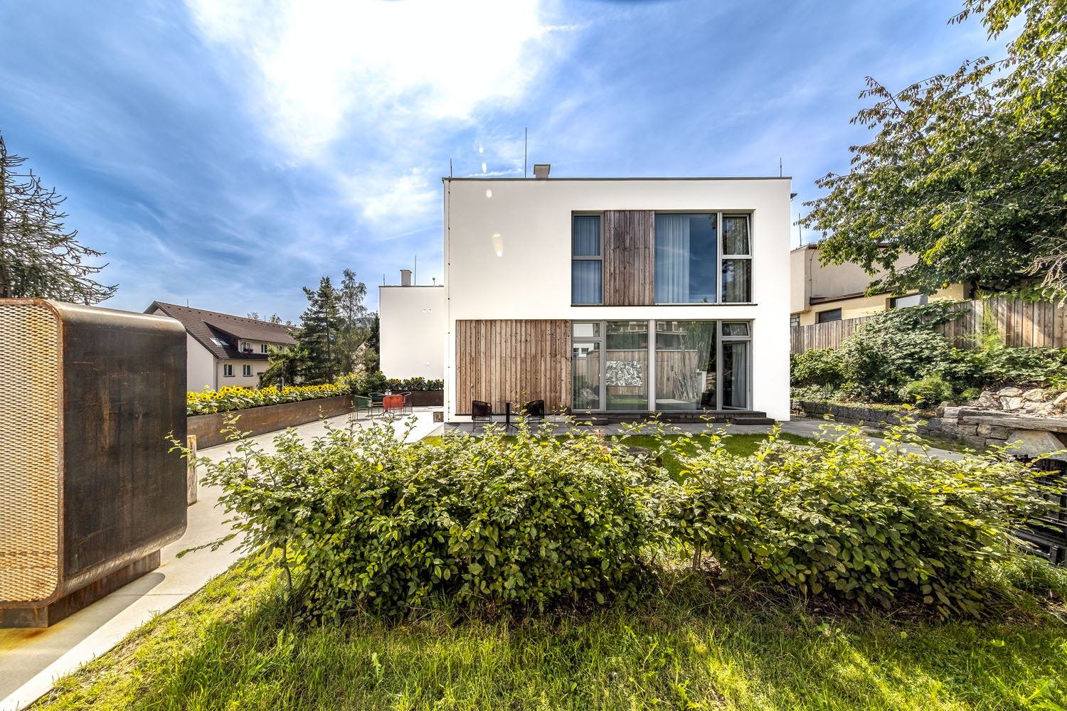 Protáhlý pás pozemků podél klidné ulice zůstával dlouho volný, protože se většina zájemců o bydlení v této lokalitě domnívala, že se tu nedá nic postavit. Malá šířka parcely a navíc prudký příčný sklon ale neodradily našeho hostitele, který zde společně s dalším investorem realizoval u nás poměrně ojedinělý projekt. Místo několika pravděpodobně nepříliš šťastně řešených a nesourodých objektů, které by tu časem pravděpodobně postavili různí stavebníci, tu vznikl sladěný celek, který nabízí harmonické prostředí, pohodlí, účelnost a úspornost. Celý komplex navrhla architektonická kancelář Kováříková Lohniský architekti.