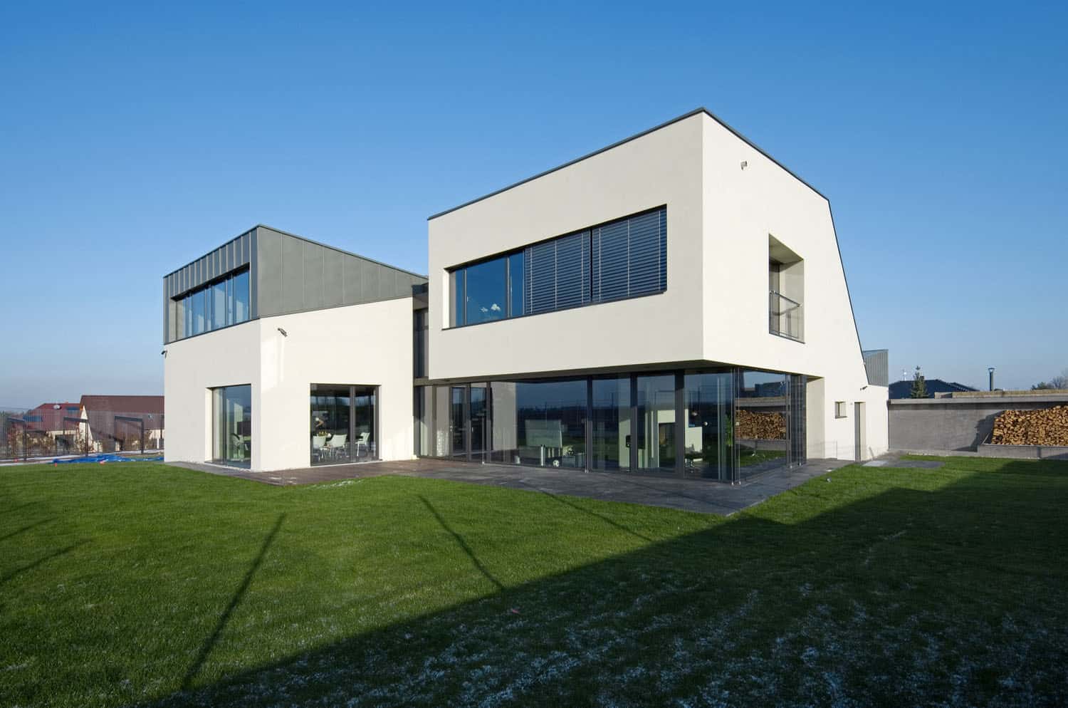 Vila v nové zástavbě v menší středočeské obci vypadá ze západní strany jako kompozice složená z krychlových hmot, z bočních pohledů se projevuje prolamovaný reliéf šikmých střešních rovin. Dva principy se prolínají i ve vnitřním uspořádání – pravoúhlou dispozici protíná oblouková křivka.