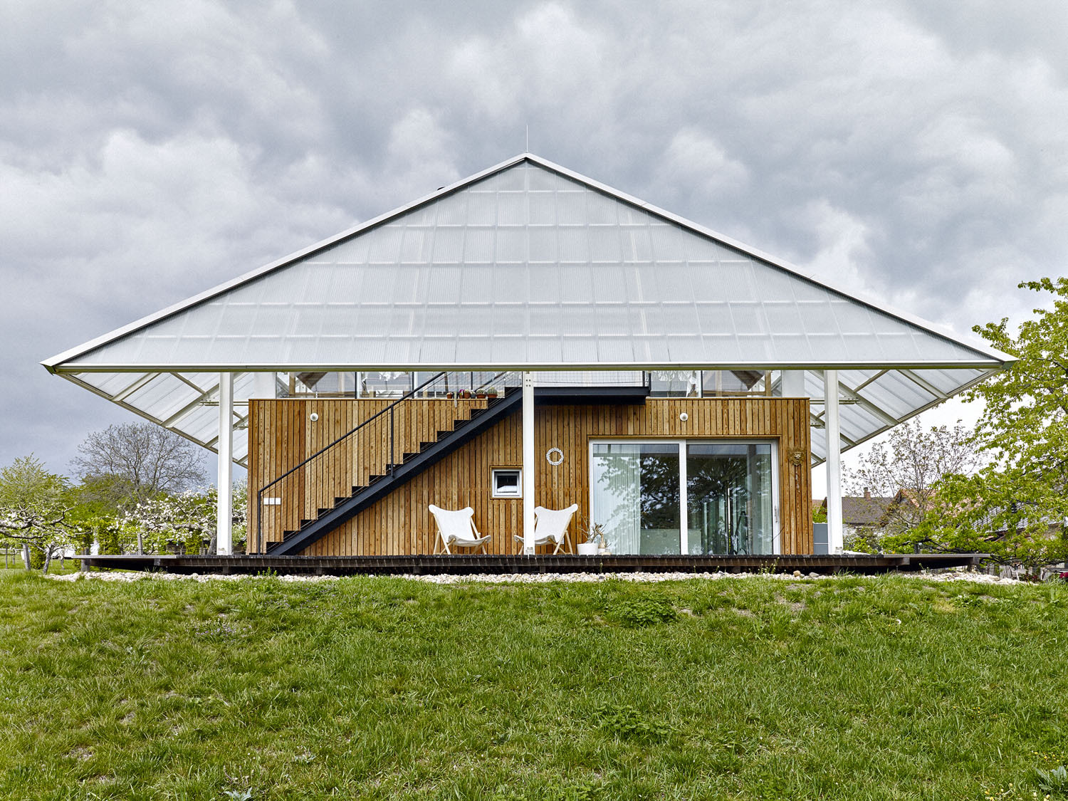 Rodinný dům měl být nejen příjemným místem pro život, zadáním byl od začátku také rozměrný skleník pro kaktusy. Jenže kam s ním, když si majitelé stavby přáli co nejhezčí výhledy do sadu a zároveň chtěli mít skleník co nejvíce po ruce? Lépe řečeno, ideálně suchou nohou.