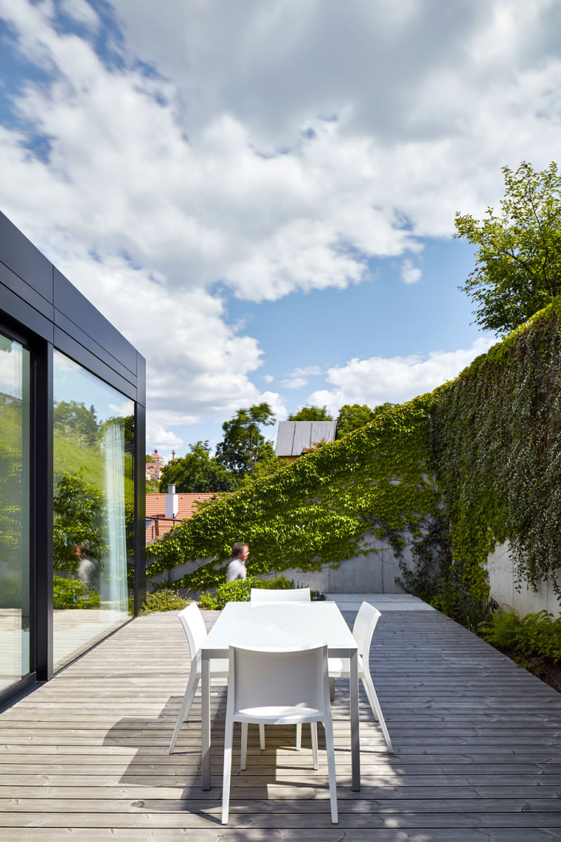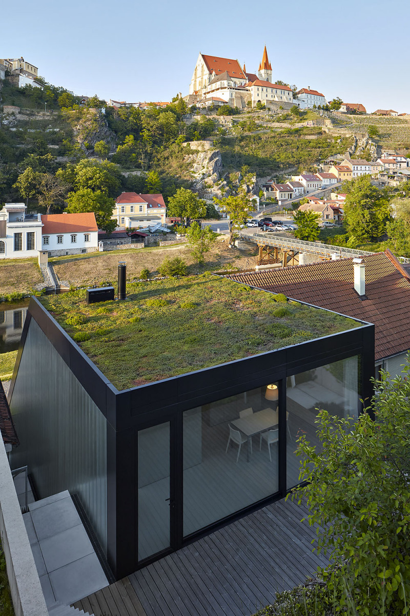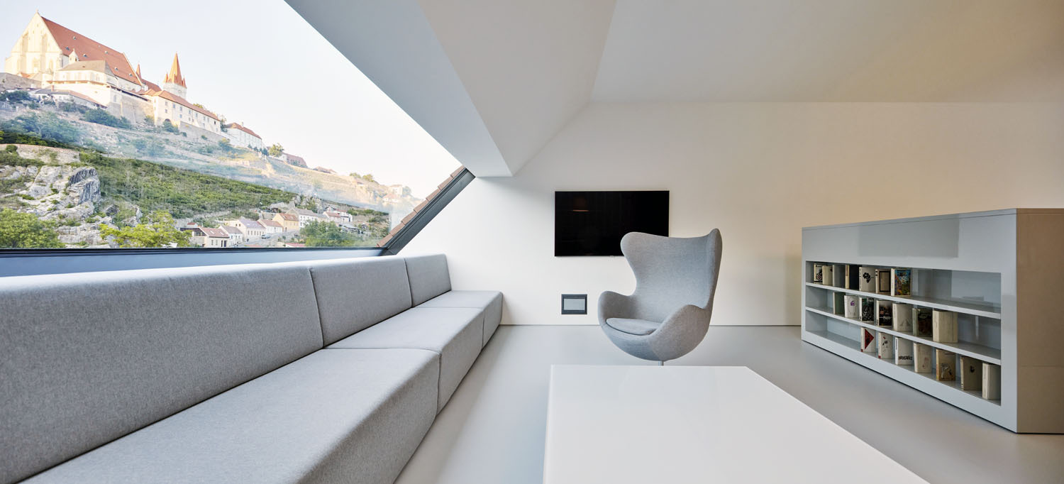 „Hlavní obytný prostor se nachází v nejvyšším podlaží. Propojili jsme ho s terasou, navazující na zahradu. K jihu se tedy k terase obrací velké okno, na sever pásové střešní okno, odkud jsou nejkrásnější výhledy do údolí řeky i na svahy s historickými památkami Znojma,“ dodává jeden z autorů.
