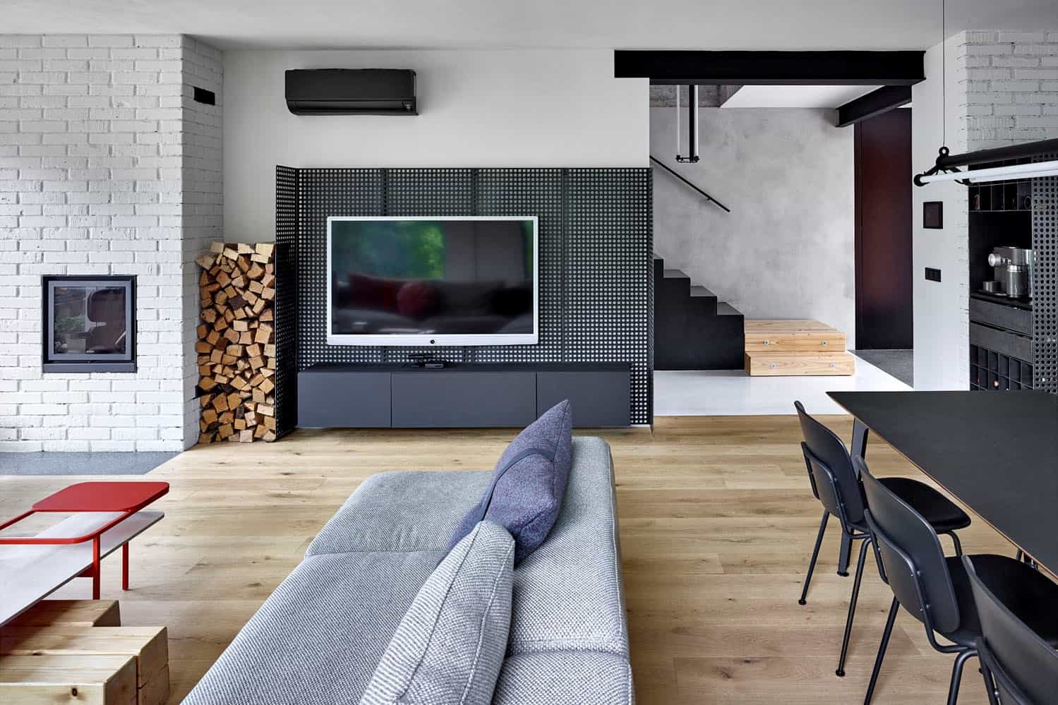 Harmonický ráz interiéru je založen na jednoduché kombinaci neutrální světle šedé barvy a výrazných materiálů: černé oceli, teraca a dubového dřeva. Tento základ se bude obměňovat a dolaďovat pomocí barevných doplňků. Na některých stěnách byly záměrně ponechány surové štukové omítky – naznačené tahy špachtlí zanechávající stopu lidské práce vytvářejí podle architektky příjemný živý dojem. Do obývacího pokoje si majitelé vybrali kvalitní sezení značky Sancal, většina nábytku včetně koupelnového byla vyrobena na míru. Byly při tom použity i části vybouraných konstrukcí, zejména starých trámů ze zrušené části střechy.