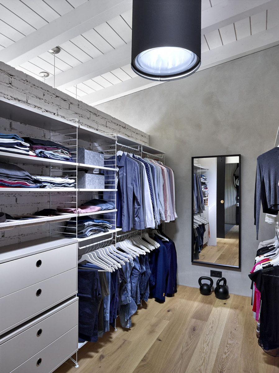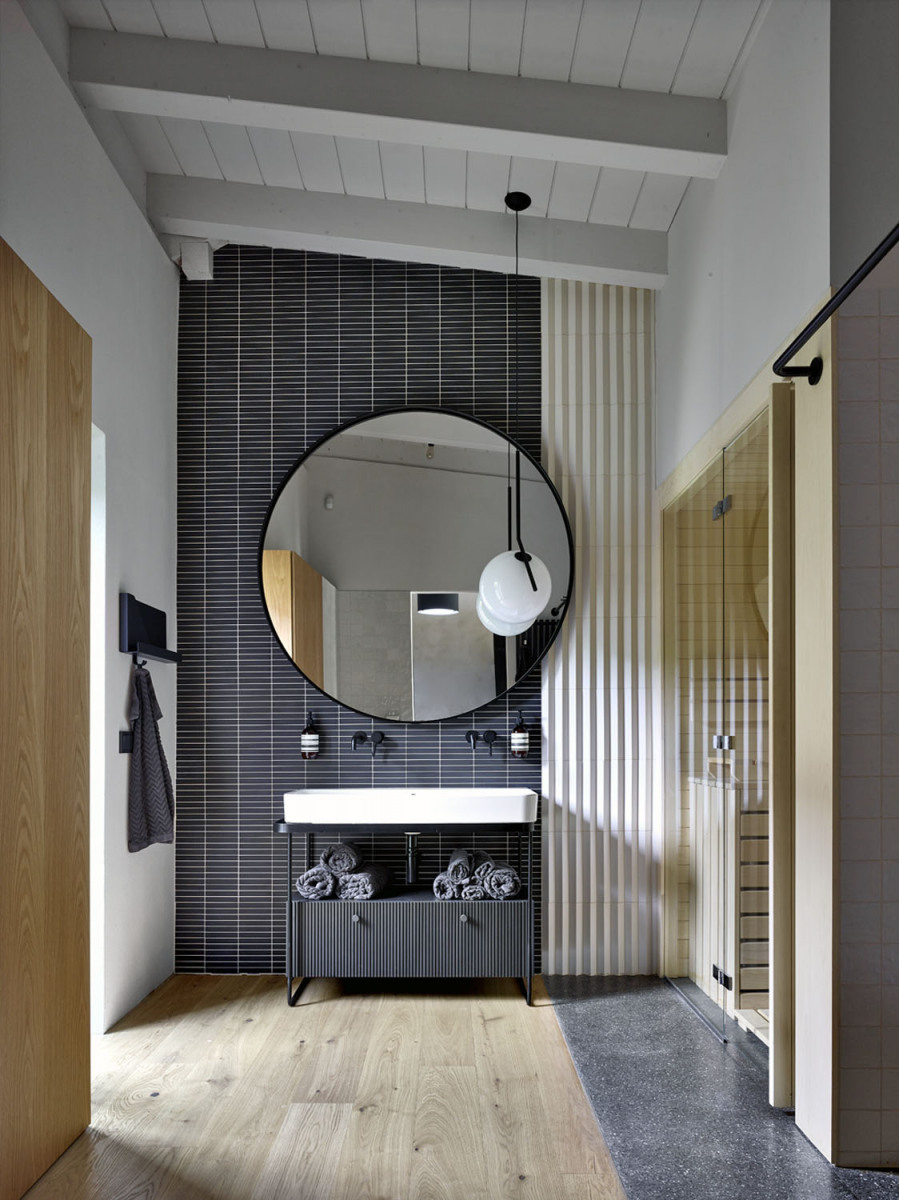 „Pro mě je světlo alfa a omega a je to vidět na realizacích, přirozené světlo dělá velkou část interiéru. Pokud rekonstruujeme, většinou zvětšujeme okna a snažím se dostat přirozené světlo i do míst, kde to lidé většinou neřeší. Platilo to i pro tento dům. Například v dětských pokojích byla původně tradiční okna s parapetem, tak jsme je protáhli k podlaze, to samé jsme udělali s okny v obývacím pokoji. Saunu jsme zase prosklili ze dvou stran, abychom skrze ni pustili přirozené světlo do chodby. Schodišťový prostor jsme prosvětlili motoricky ovládaným střešním oknem, stejně tak horní koupelnu. Pro ni jsem si vzhledem k vlhkosti prostředí nechala doporučit bezúdržbové okno VELUX, tedy bílou polyuretanovou vrstvou potažený dřevěný rám.“ V šatnách, kde nebylo možné využít denního světla, byly instalovány světlovody.