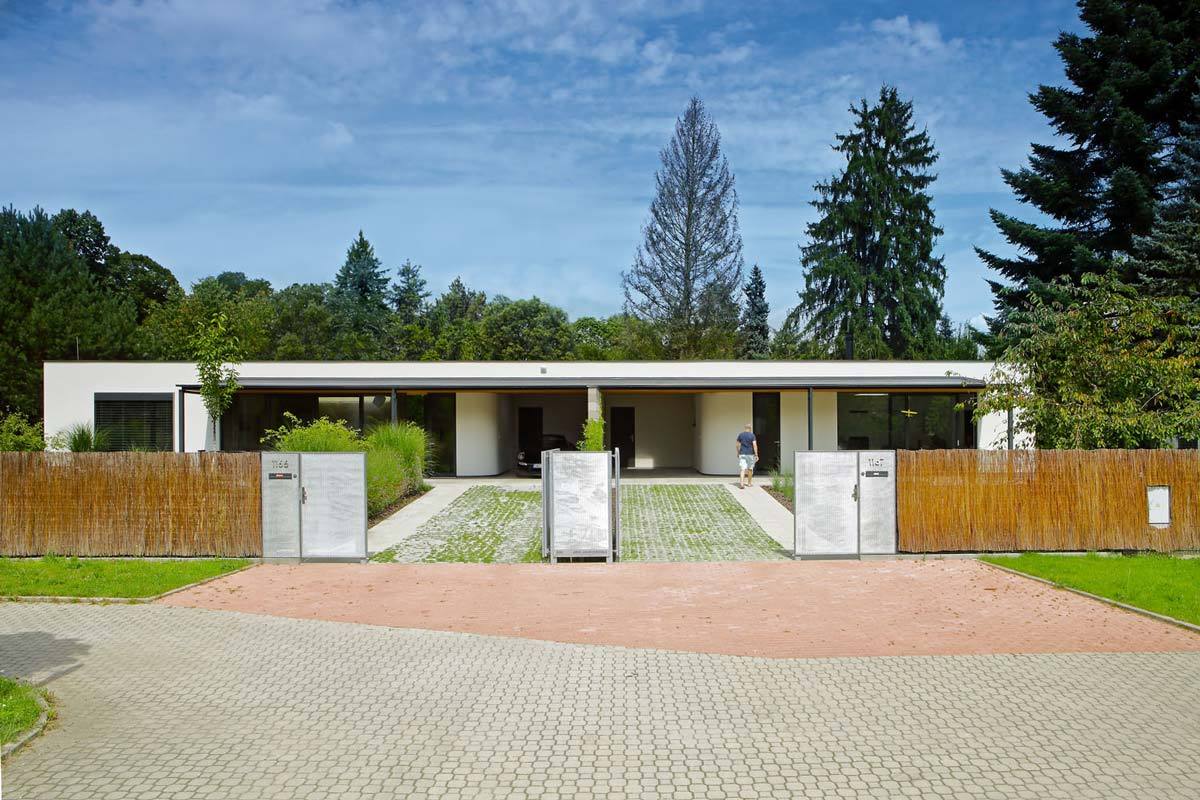 Jednopodlažní nepodsklepená stavba s plochou střechou stojí na rovném pozemku u lesa, na obdélníkovém půdorysu. Původní pozemek se starým, již nevyhovujícím rodinným domem byl rozdělen na dvě stejně velké parcely o rozloze 530 m2. Byly na ně navrženy dva nezávislé domy s dělicí stěnou na společné hranici. Každý dům má jinou dispozici, ale do ulice se tváří jako jeden. Západní část „dvojdomí“ o dispozici 4 + kk je určena k trvalému bydlení a východní poslouží jako „chata“ (3 + kk) pro sezonní bydlení pro část rodiny žijící v zahraničí.
