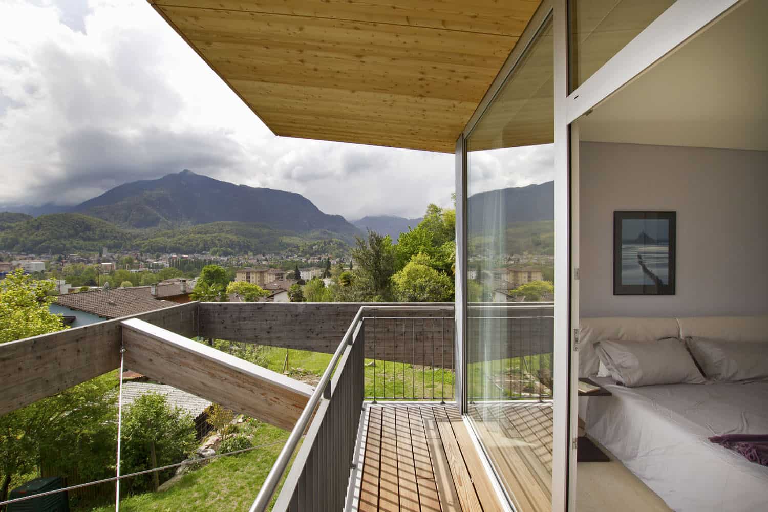 Širokoúhlý výhled na jezero Lago Maggiore, na starou část městečka Solduno s kamennými střechami a na fascinující siluetu alpských štítů tvoří rámec, který obklopuje parcelu na slunném západním svahu. Dům je jak vzhledem k výhledu, tak z důvodů energetických úspor otevřen na jih a na západ, ze severu mu „kryje záda“ zvedající se terén. Velké prosklené plochy fasády jej naplňují světlem a sluncem a „vtahují“ dovnitř působivé okolní panoráma, s nímž chtěla mladá rodina co nejvíce splynout. Proti přehřívání ho chrání výrazný rámový slunolam, který tvoří dominantu celé stavby.