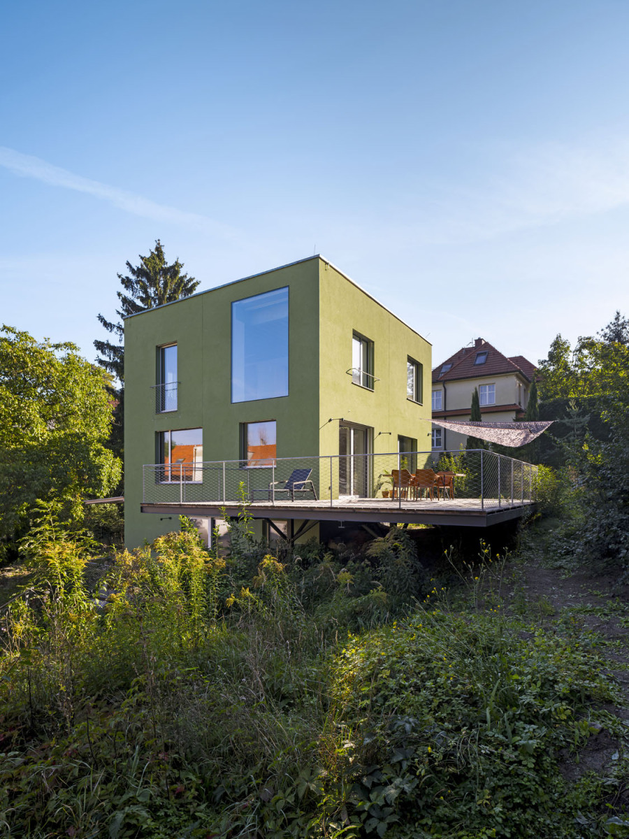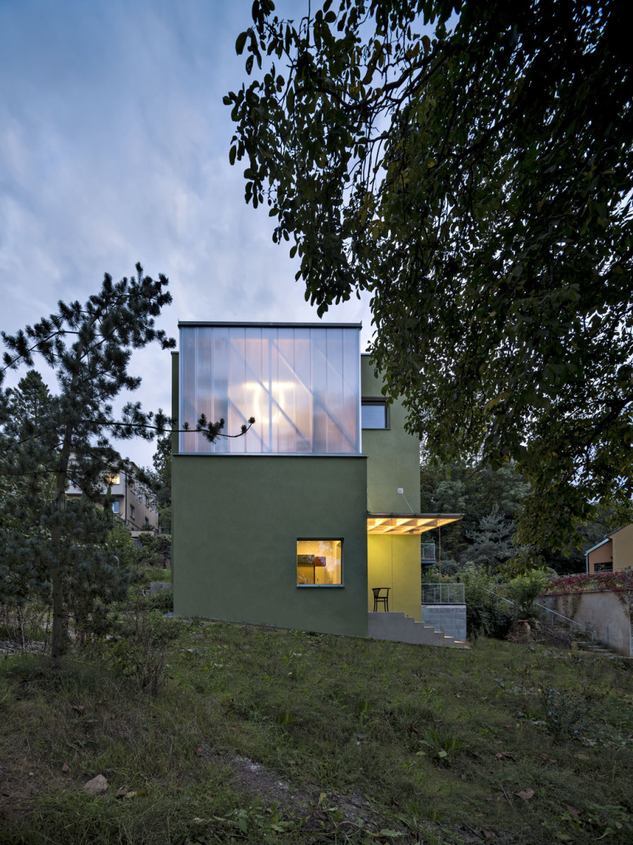 Zadáním pro architekty byla přestavba opotřebovaného rodinného domu ze šedesátých let na vilu vysokého standardu. Nový dům je svým způsobem výrazný, ale zároveň kultivovaný – má jednoduchý štíhlý tvar, krásnou mechovou barvu břízolitové omítky rozehrály různé formáty oken. K jeho půvabu přispěla i levitující terasa, která pluje nad svažitou zahradou.