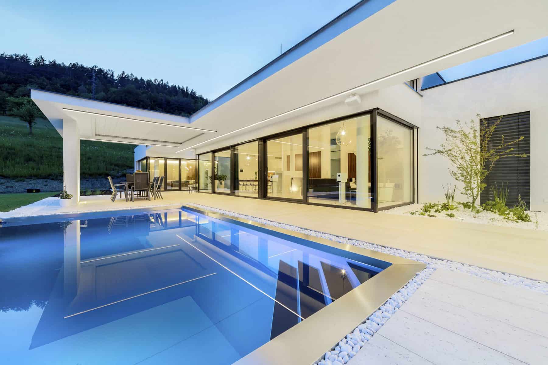 Realizaci nevšedního domu ovlivnily tři pozitivní výchozí faktory. Investor má dlouholeté zkušenosti s podnikáním ve stavebnictví a dům stavěl ve spolupráci se svým synem, rovněž stavitelem. Na základě referencí oslovil architektonickou kancelář Kareš Rais, která se může pochlubit desítkami realizací nadstandardních vil. A třetím vrcholem šťastného trojúhelníku pak byl rozlehlý krásný pozemek na okraji obce, který přechází z roviny do svahu se starým trnkovým sadem a lesem. Zádumčivé ranní mlhy, romantické červánky, stejně jako srnky a zajíce mají majitelé za okny jako na dlani.