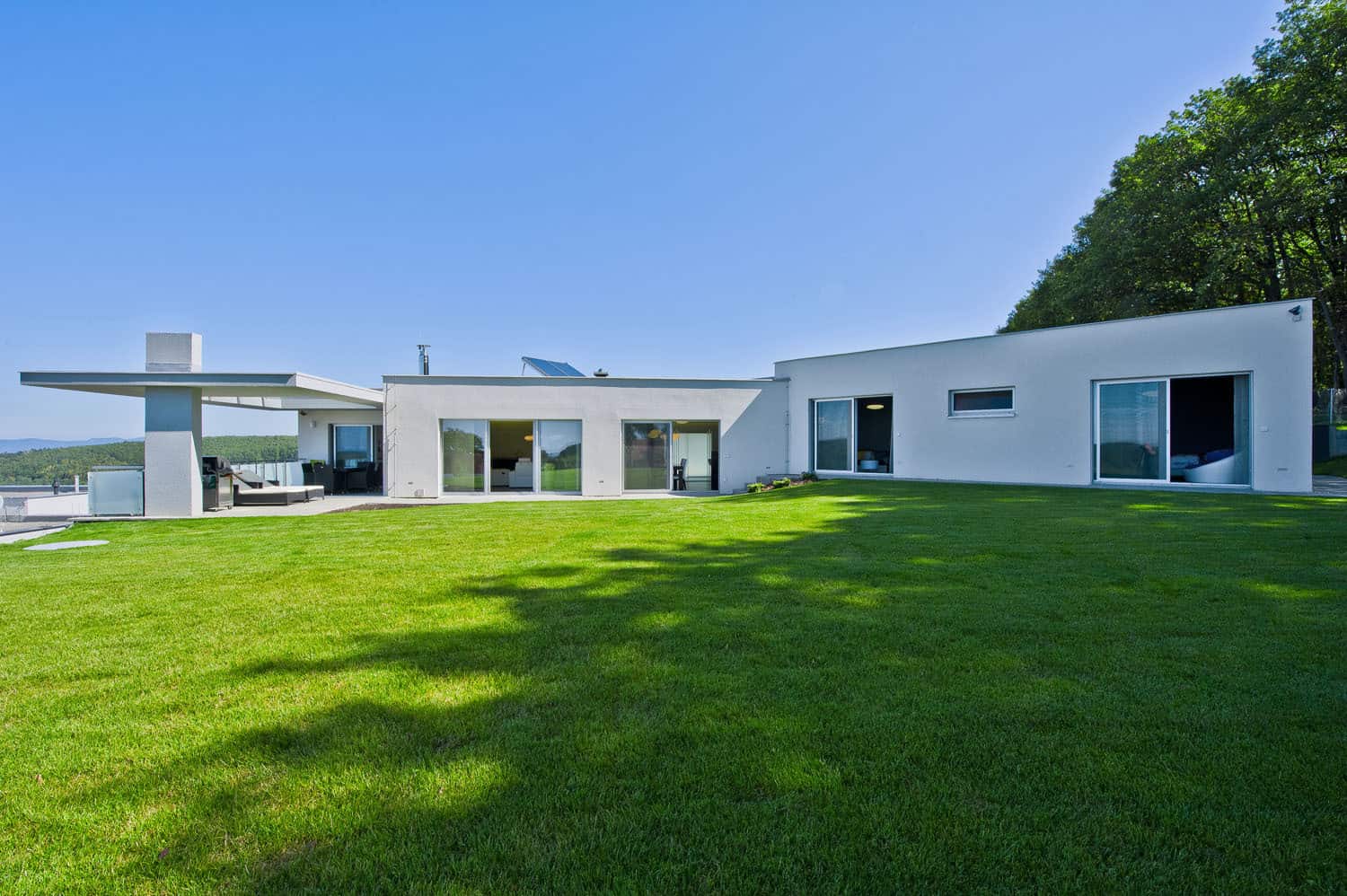 Na radu architektů z brněnského ateliéru Europrojekta si majitelé vybrali místo v nejvyšší části nově zastavovaného svahu. Z východu je částečně zastíněn malým listnatým hájkem, dotvářejícím intimitu parcely, a má zcela jistě nejkrásnější výhled ze všech domů, které zde v budoucnu vyrostou. Na architekty pak čekal nelehký úkol: jak se vyrovnat s architektonickým odkazem, který tu zanechaly předchozí generace, přinést nové myšlenky a zároveň se s pokorou a citem zapojit do hezkého přírodního prostředí? „Ctíme zásady funkcionalistické školy, na kterou se snažíme navazovat,“ říká autor návrhu stavby, architekt Martin Kareš. „Čistota tvarů, vztah k místu, střízlivý design, přehledná dispozice, přímé komunikační a pohledové linie považujeme za základní výchozí principy, na nich jsme se s našimi klienty také od počátku shodli.“