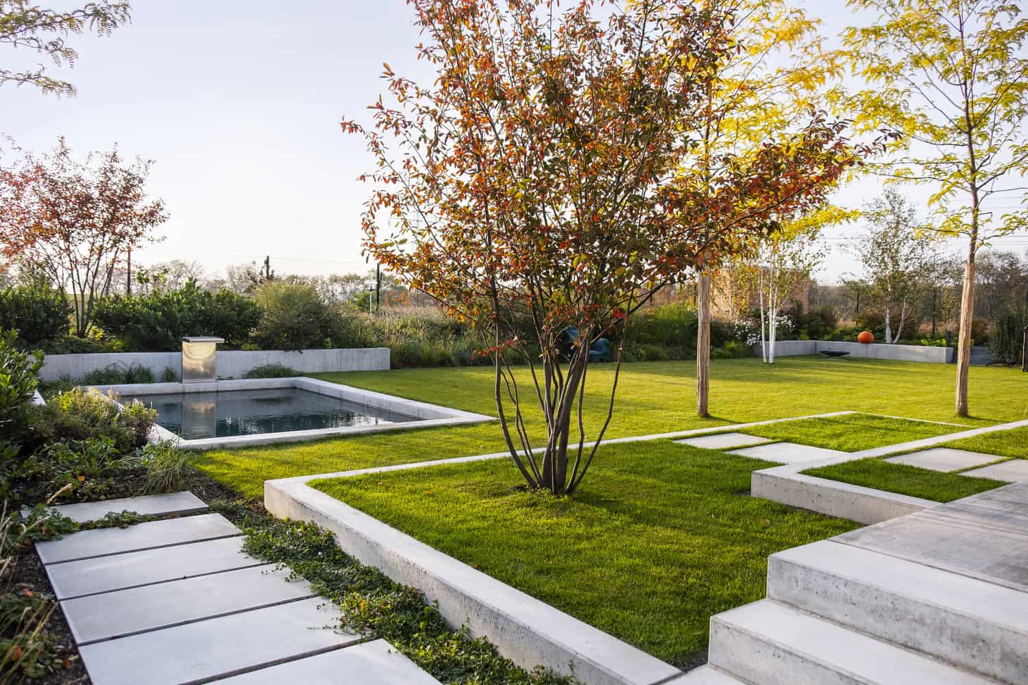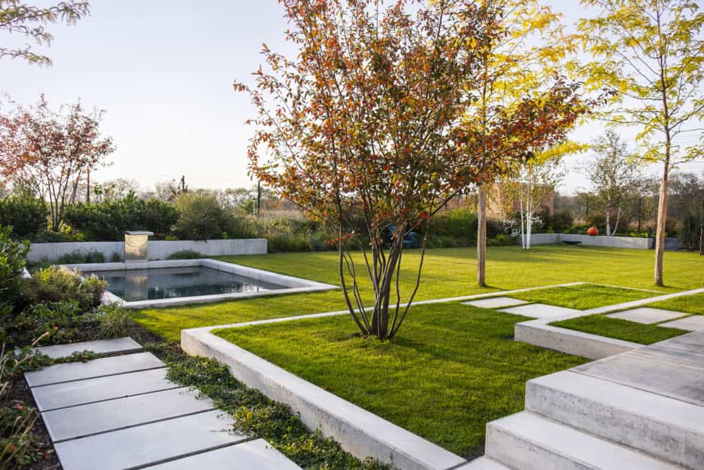 Zahrada u moderního rodinného domu nabízí dostatek soukromí i přirozenou sounáležitost s okolím. Nejvýraznějšími prvky tohoto impozantního přírodního prostoru jsou betonový bazén a betonové rámečky s trávníkem. Kontrast čistého betonu s přírodní zelení umocňuje zajímavě řešené osvětlení zahrady.