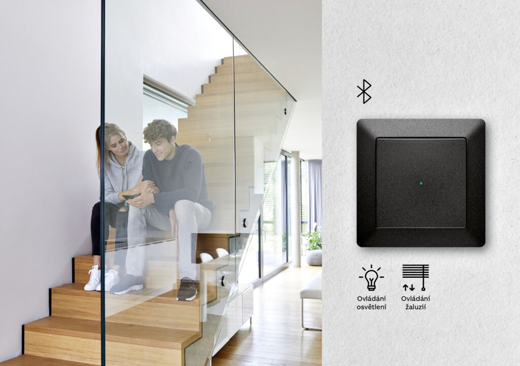 Vypínač Zoni pro systém chytré elektroinstalace ABB-free@home® pro ovládání osvětlení a předokenních žaluzií, design je sladěn s řadou standardních vypínačů a zásuvek Zoni www.abb.cz