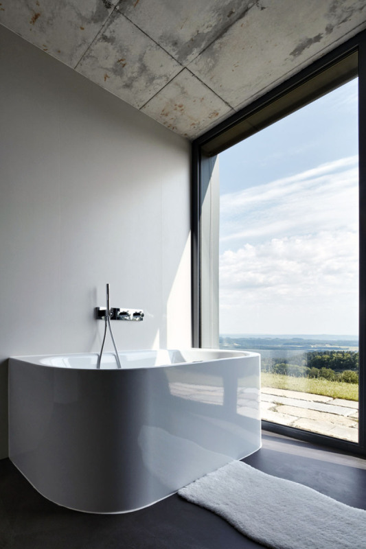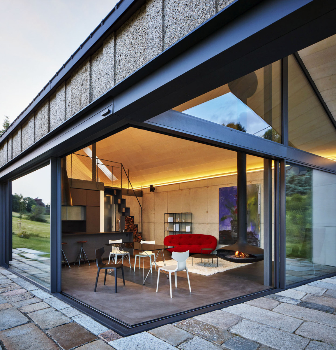 V kraji pod Ještědem hodně fouká vítr, je tam poměrně často mlha, hodně prší. Takže bylo důležité, aby část terasy byla zastřešená. Proto jsme hmotu domu „přetáhli“ z interiéru ven, chtěli jsme smazat rozdíl mezi interiérem a exteriérem velkými prosklenými plochami. Navrhli jsme nestandardní řešení, kdy se dvě velká posuvná okna rozjíždějí v rohu, v němž se nenachází žádný sloupek. Pokud se tyto dveře otevřou, interiér se zde naprosto volně propojí s exteriérem a člověk se stane součástí okolní krajiny. Použili jsme poměrně kvalitní hliníkové profily s trojsklem, s vysokým tepelným odporem, takže s tepelnými úniky žádný velký problém nevznikl.