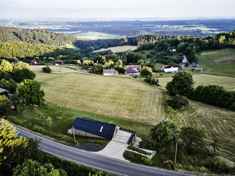Jedná se o podlouhlý pozemek podél komunikace, která vede pod ještědským hřebenem. Je tam nádherný výhled do kraje, za dobrých podmínek je krásně vidět téměř až do Prahy nebo i dál. Výhled byl jedno z hlavních kritérií při navrhování domu. Zároveň je pozemek poměrně strmý. Dům se nachází pod komunikací na náspu, takže jsme potřebovali vyřešit přístup i parkování aut, abychom nemuseli dělat velké terénní úpravy. A tak jsme parkování umístili na střechu přízemí domu. Zároveň jsme chtěli, aby přízemí bylo spojeno se zahradou. Místní regulace stanovila sklon střechy 45 až 30 stupňů. Využili jsme oba dva tyto úhly, takže v jedné části domu je to 30 stupňů (tam, kde je dům jednopodlažní) a ve druhé části, kde je nástup z parkingu, máme 45 stupňů, aby tento prostor byl využitelný v obou podlažích.