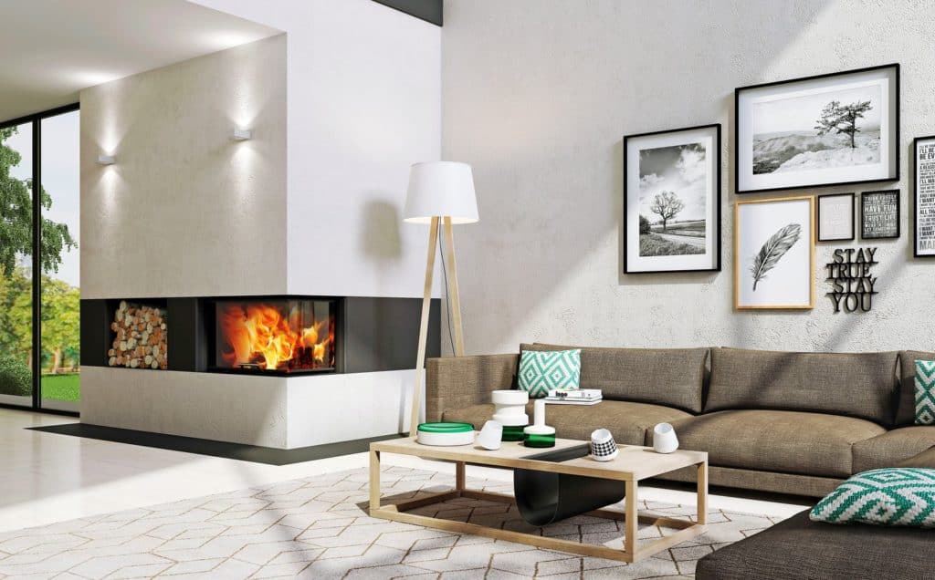 Obestavěná teplovzdušná rohová krbová vložka z řady Heat s ohýbaným sklem a regulovatelným výkonem 3,5–9,0 kW (ROMOTOP)