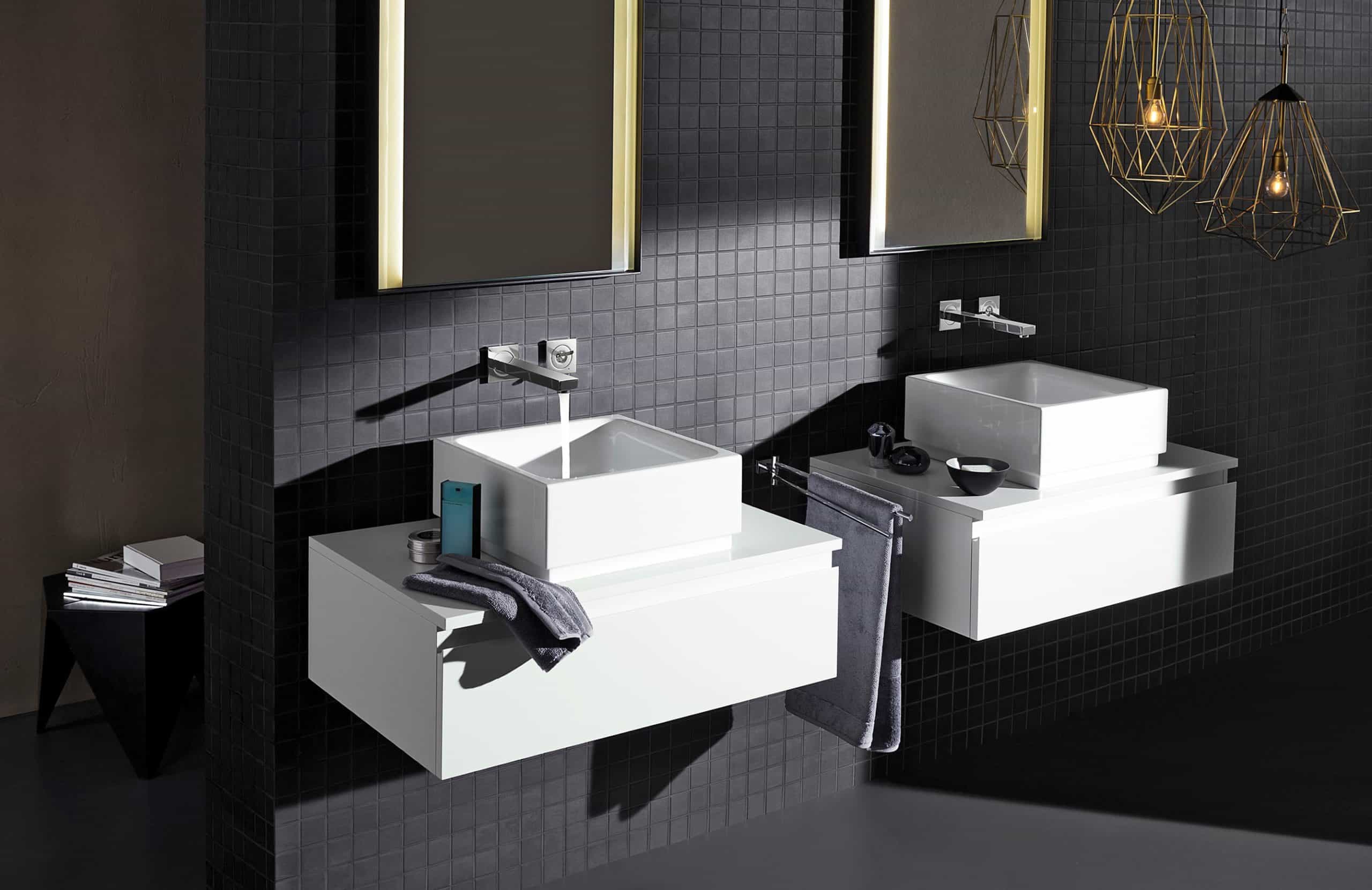 Umyvadlová dvouotvorová baterie Eurocube Joy, velikost M, je určena pro montáž na stěnu pomocí podomítkového tělesa, cena 7 566 Kč (GROHE)