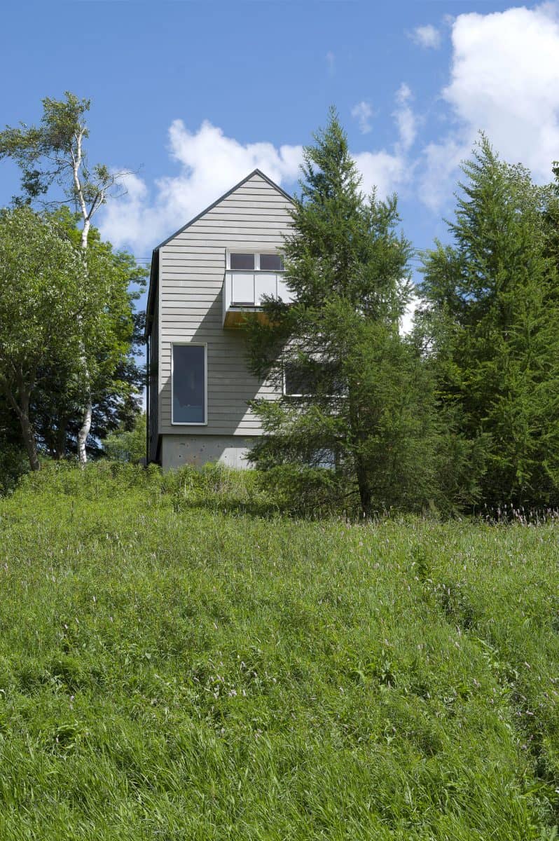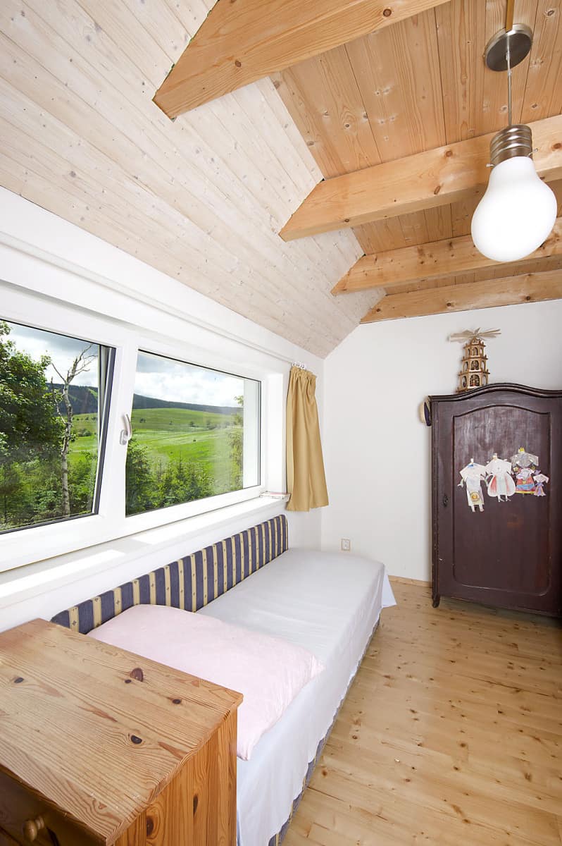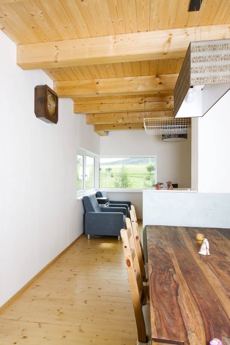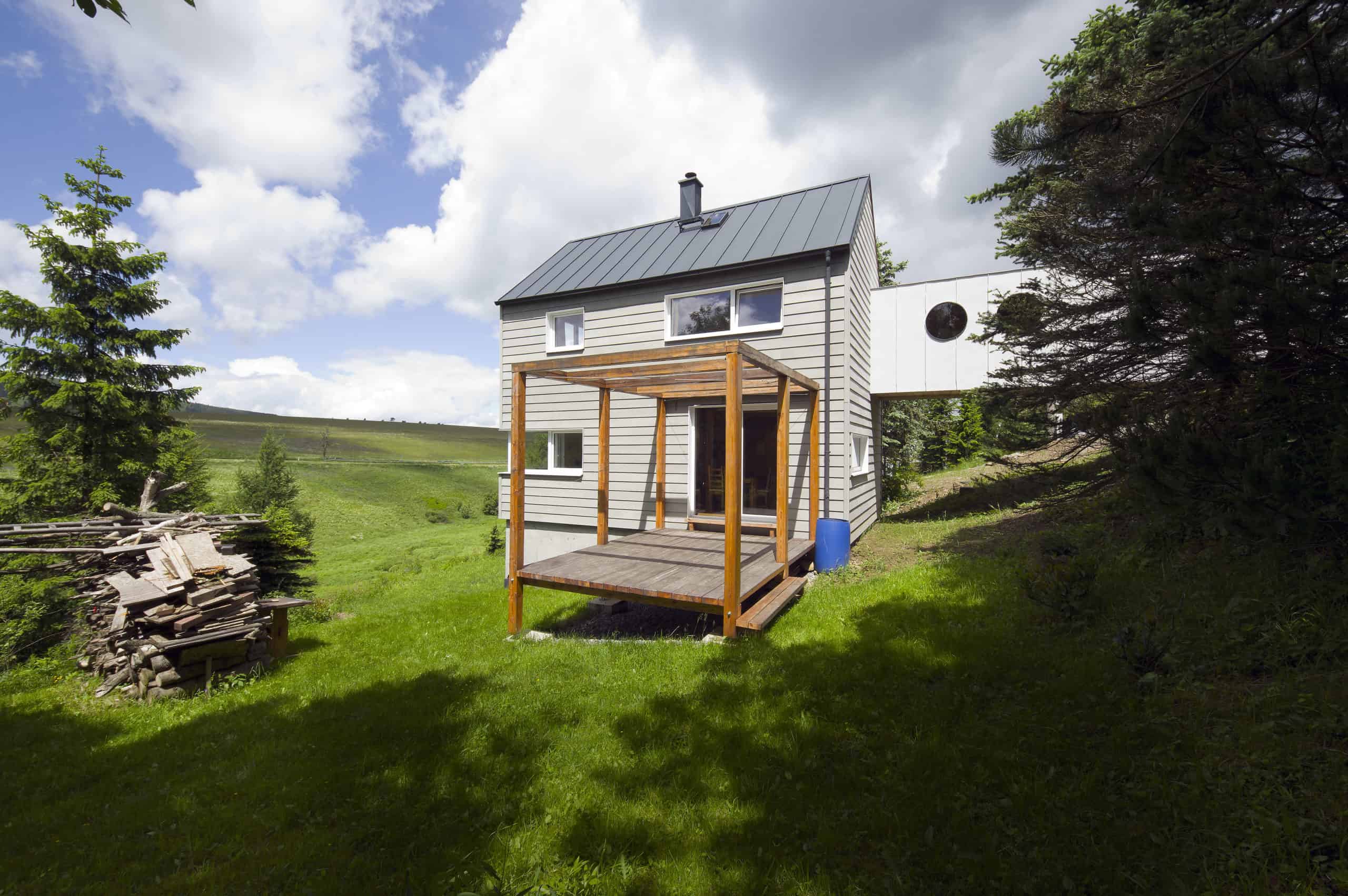 Malý dům v obci pod Klínovcem na první pohled zaujme propojením s přilehlou silnicí pomocí dřevěného mostku. Krytá lávka umožňuje pohodlný vstup do domu, a to i v zimním období. Motiv lávky je v dané lokalitě navíc rozšířeným tradičním prvkem.