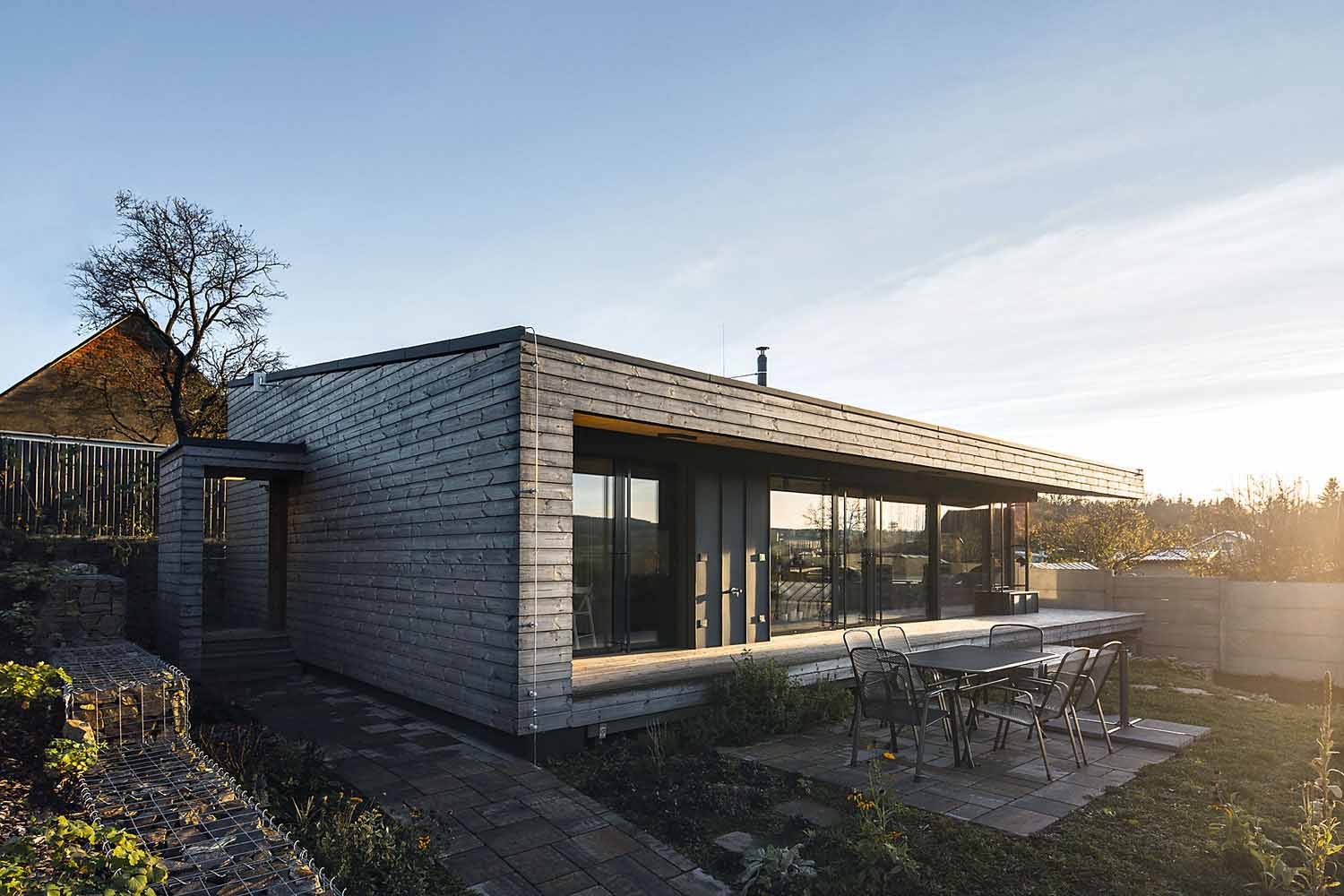Vzhledem k tomu, že majitelé mají vztah ke dřevu, rozhodli se jej maximálně využít jak na samotnou konstrukci, tak i na fasádu. Zvolili panelový konstrukční systém Novatop od českého dodavatele a trvanlivé dřevěné obložení fasády z thermowoodu. Návrh svěřili pražskému ateliéru 3AE, který má s dřevostavbami zkušenosti. Dům stojí v horní části pozemku, příjezdová komunikace vede zespodu. Dlouhá parcela nepravidelného tvaru se mírně svažuje k západu a zahrada před domem je dost velká pro rekreační využití. Ve spodní části bylo vybudováno krásné zapuštěné gabionové ohniště a zůstala tu i řada ovocných stromů. Nahoře za domem je malá užitková zahrádka.