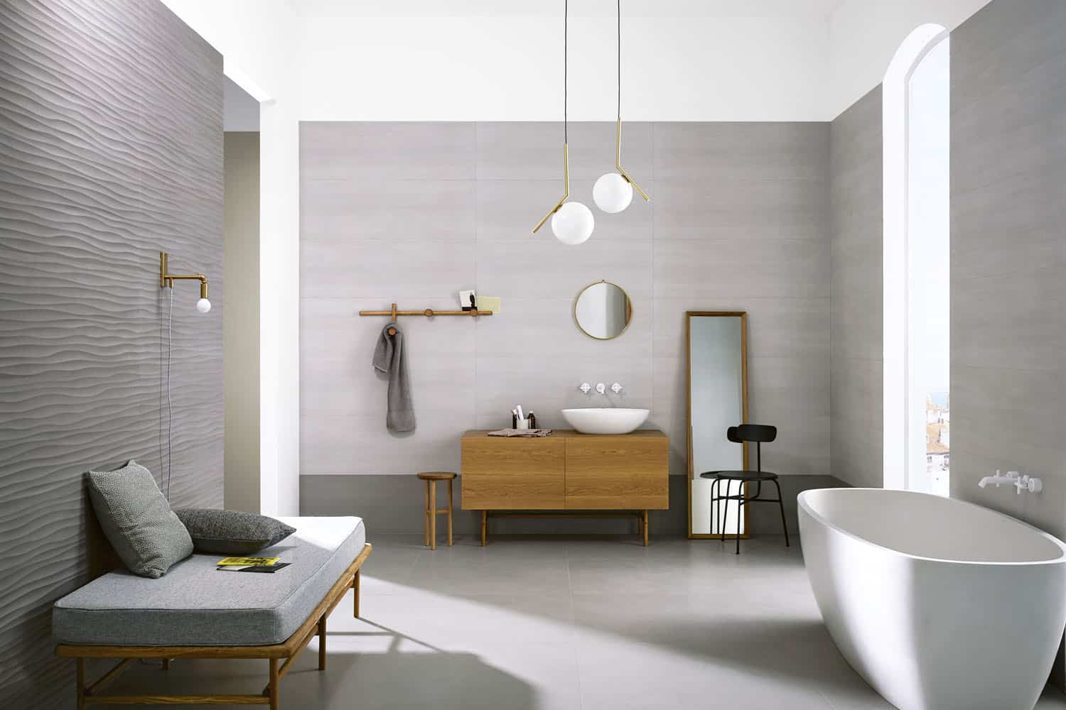 Obklad s betonovým vzhledem z kolekce Materika (Marazzi), rozměry 40 x 120 cm, cena 2 530 Kč/m2, www.koupelny-ptacek.cz