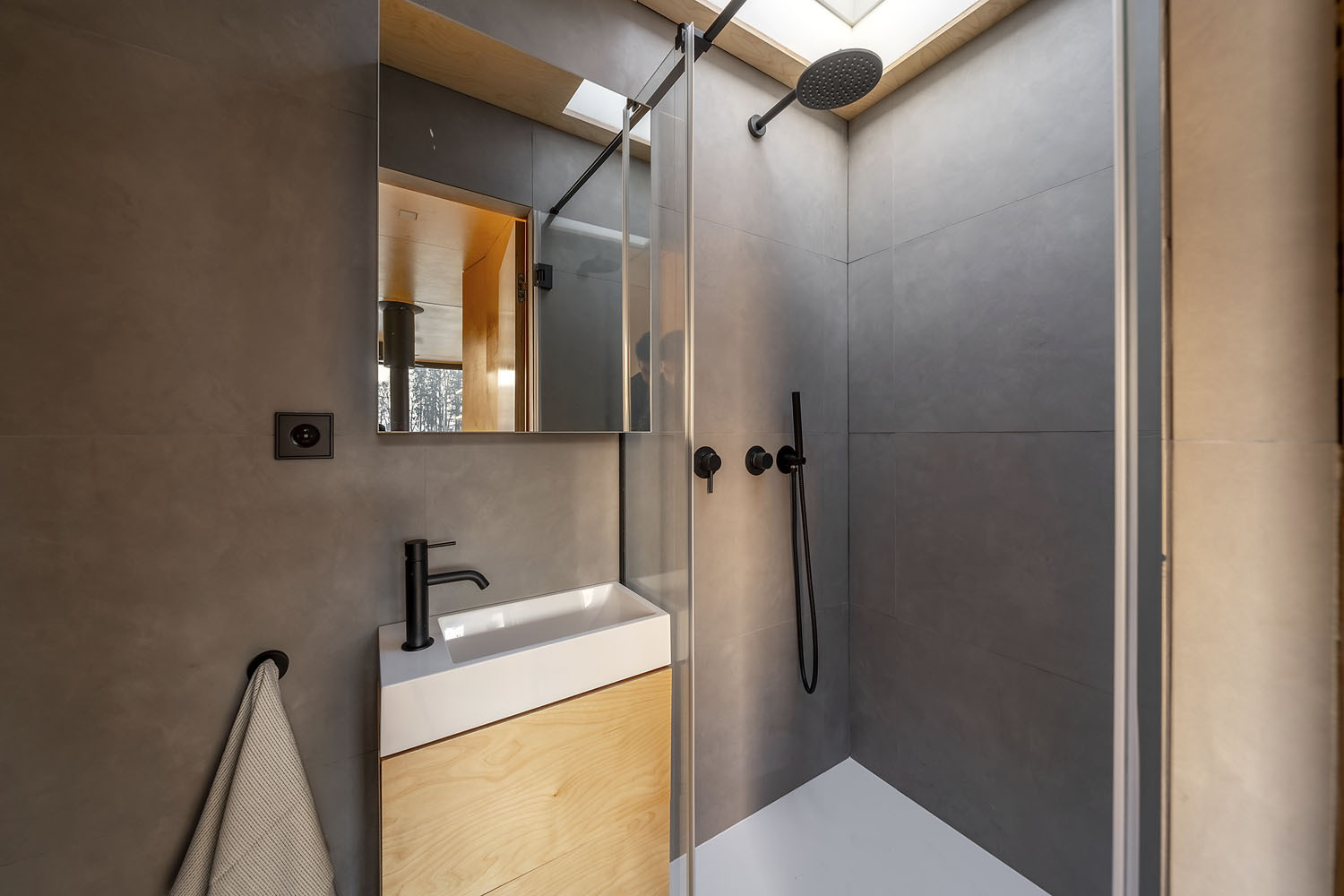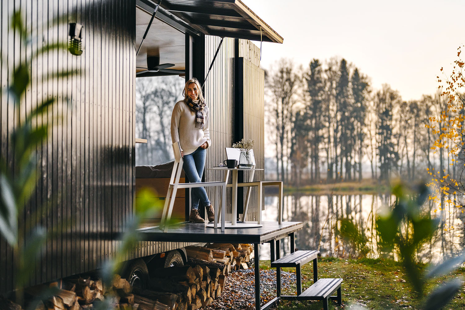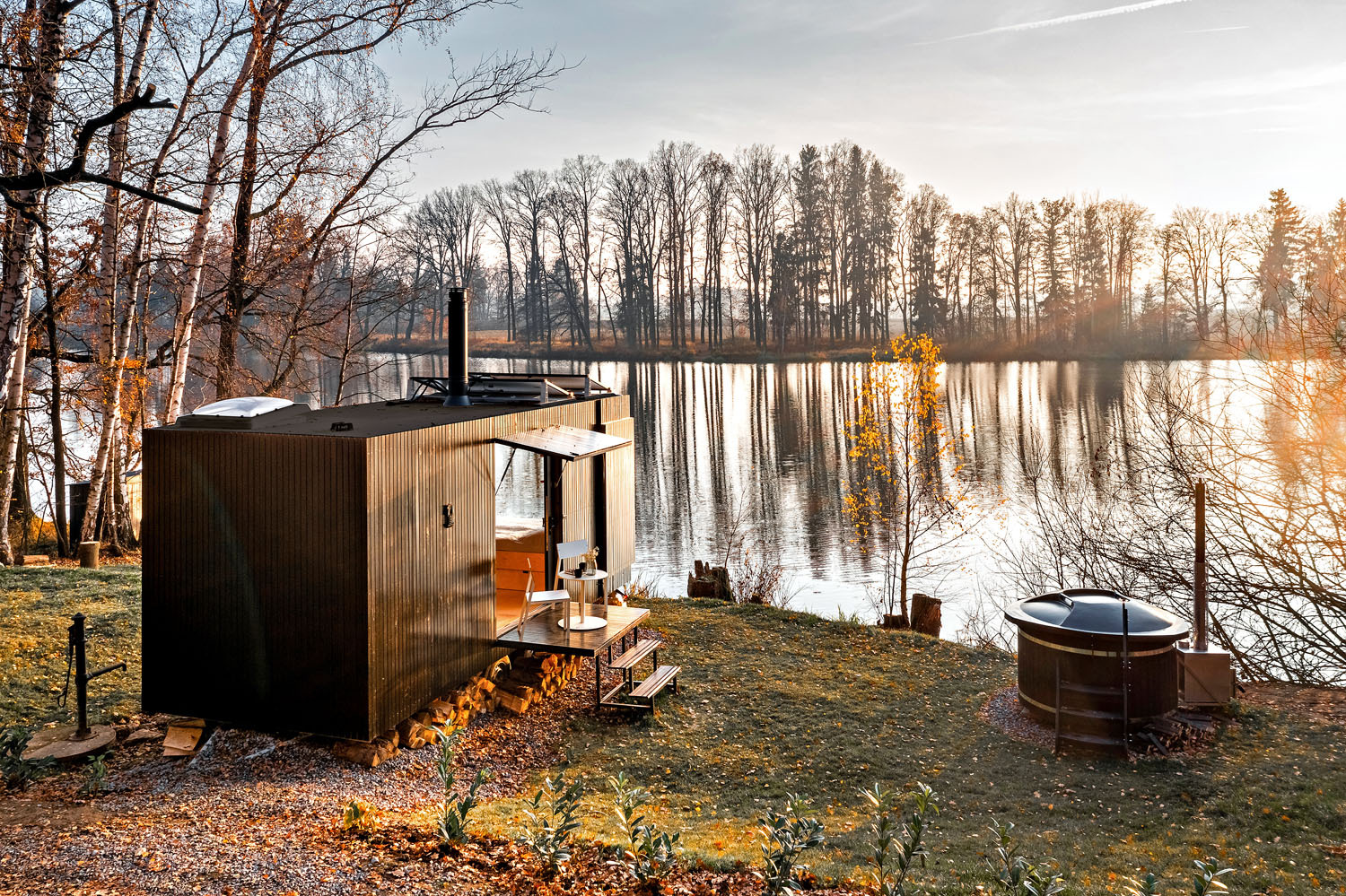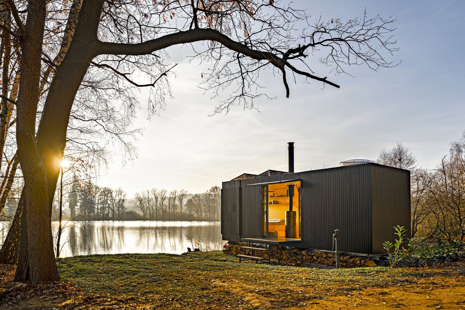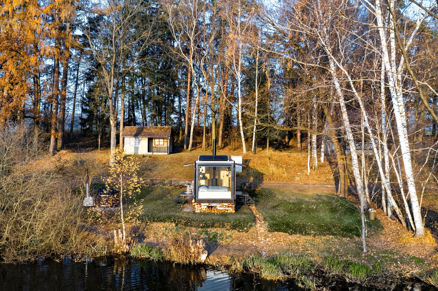 Mobilní obytný kontejner je usazen na břehu Hejlovského rybníka na Vysočině a na necelých 15 m2 nabízí vše, co jeden až dva lidé potřebují ke komfortnímu pobytu. Snahu o udržitelnost projevili autoři návrhu nejen v použitých materiálech, ale také v energeticky soběstačném řešení jednotky.