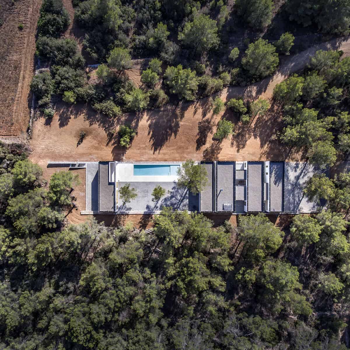 Planina Sant Matteu d’Aubarca, kdysi zemědělsky obdělávaná oblast, je dnes opuštěná, postupně zarůstá piniovým lesem a mění se v pustinu. Právě toto tiché místo, uklidňující protiklad přetechnizované civilizace, si početná rodina vybrala pro svůj nový domov. Koncept moderního domu využívá tradiční prvek, který je pro tuto krajinu po staletí typický – terasovité políčko ohraničené nízkými suchými kamennými zídkami.