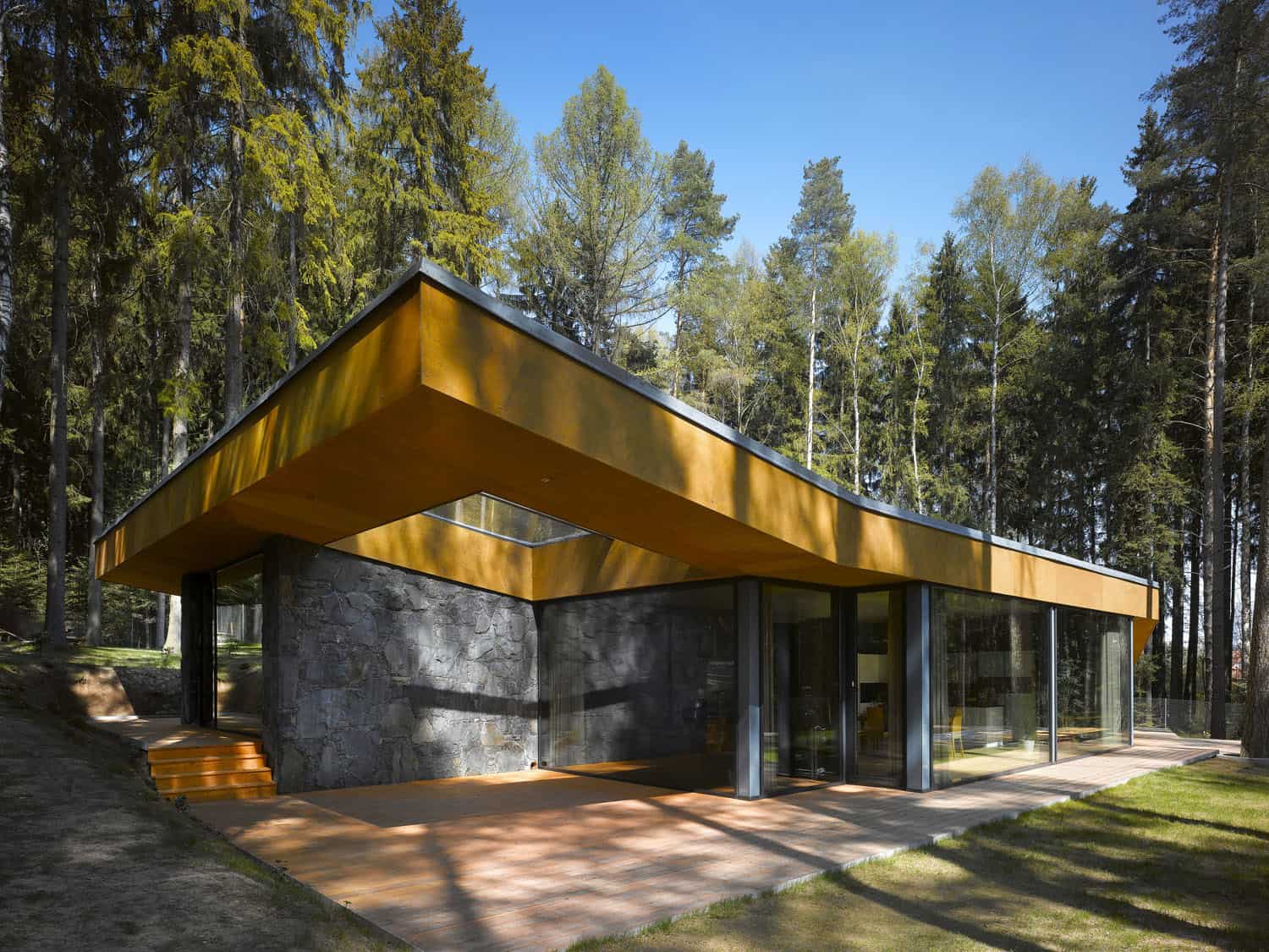 Pojem harmonické soužití s přírodou se dnes často používá, málokdy se ale podaří opravdu naplnit jeho obsah. Na mírně svažité lesní parcele na okraji bývalého lázeňského letoviska prosvítá ve stínu vysokých jehličnanů skleněná fasáda přízemního domu, která zrcadlí les a protější rybník. Nevtíravý dům přímo zosobňuje představu ideálního bydlení.