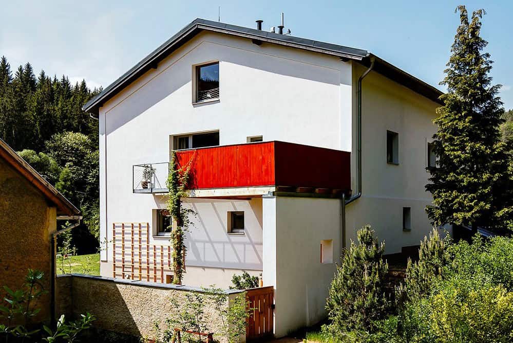 Vnější úpravy byly zaměřeny hlavně na východní štítovou fasádu. Nyní tu jsou velká okna a pobytová terasa na úrovni obytné kuchyně. Terasa je přístupná přes spojovací ocelovou lávku, je z ní hezký výhled na skalku a otevřené údolí Zbirožského potoka. V severní fasádě vznikly dva nové menší otvory prosvětlující schodiště, jižní fasáda byla na přání rodičů až na malé zvýšení parapetu jednoho okna zachována.