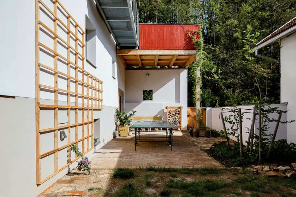 „Vybudování terasy umožnilo zakrytí předprostoru vstupu, který funguje jako tradiční zápraží u venkovských domů. Vzhledem ke zvýšenému přízemí je terasa poměrně vysoko nad dvorkem, její měřítko v pohledu z hlavního dvora evokuje otevřenou salu terrenu, z prostoru mimo usedlost zase bezpečnou obranou baštu. Z obou těchto pohledů terasa proporčně odpovídá vysoké a objemné budově mlýna,“ uvádí Tomáš Petrášek.