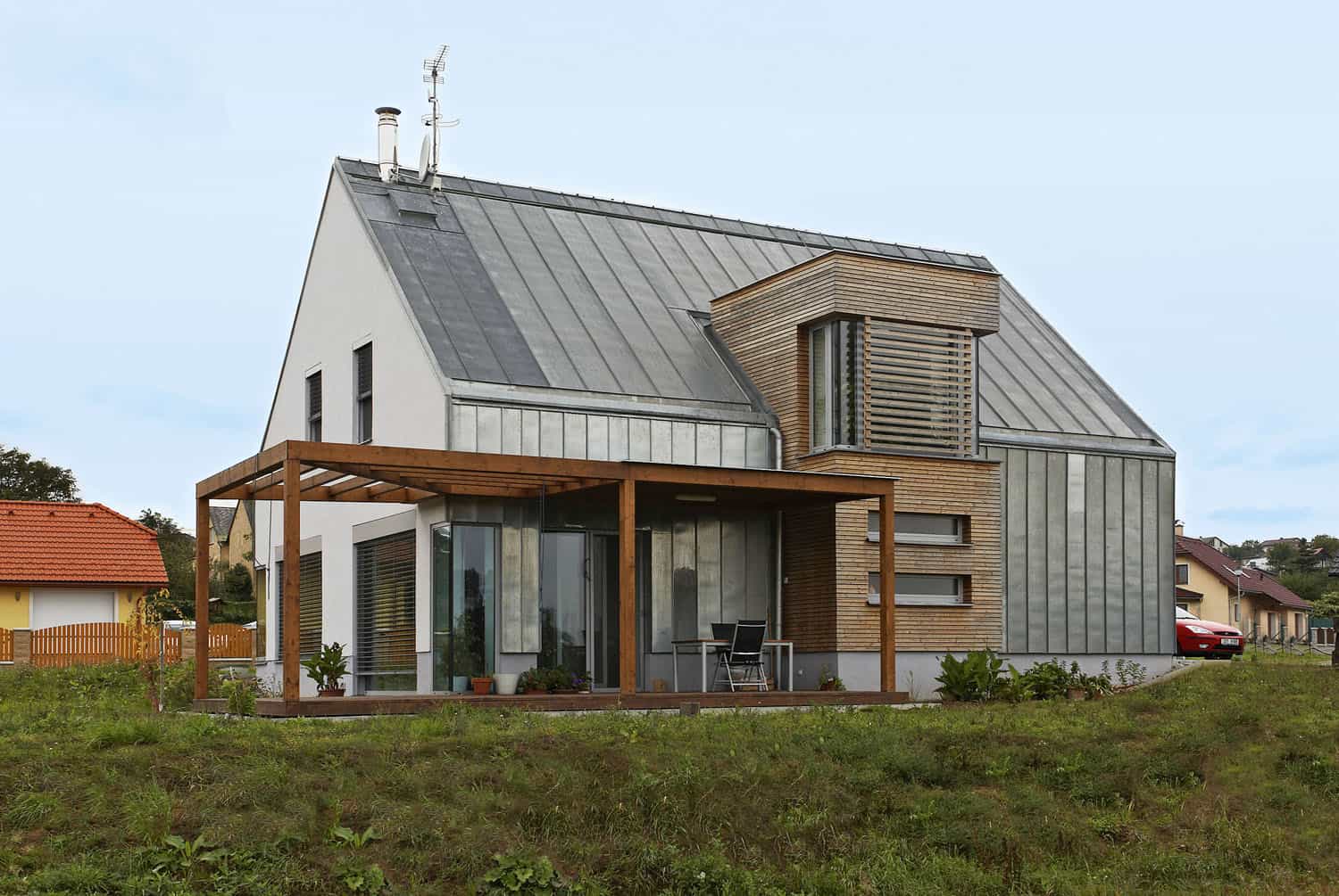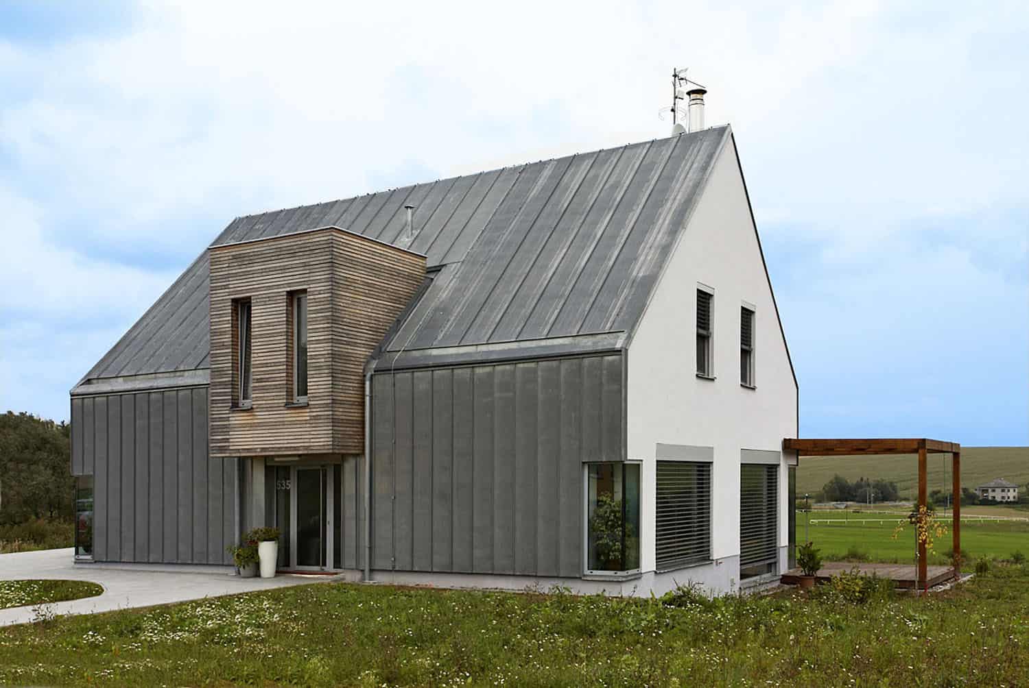 Obraz moderně pojatého venkovského domu rámuje nová zástavba na okraji vesnice a výhled na pás nízkých moravskoslezských kopců.