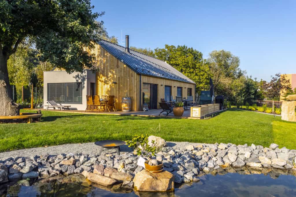 Pozemek se starým stromem a málo sousedy nabízel dost místa pro dům a samostatnou garáž. Zahrada je slunná a poměrně velká, proto se manželé rozhodli připojit k domu také rohovou terasu, kde mohou sedět buď ve stínu, nebo na sluníčku, a na zahradě vybudovali bazén a jezírko pro okrasu. Vše elegantně sladili v moderním přírodním stylu.