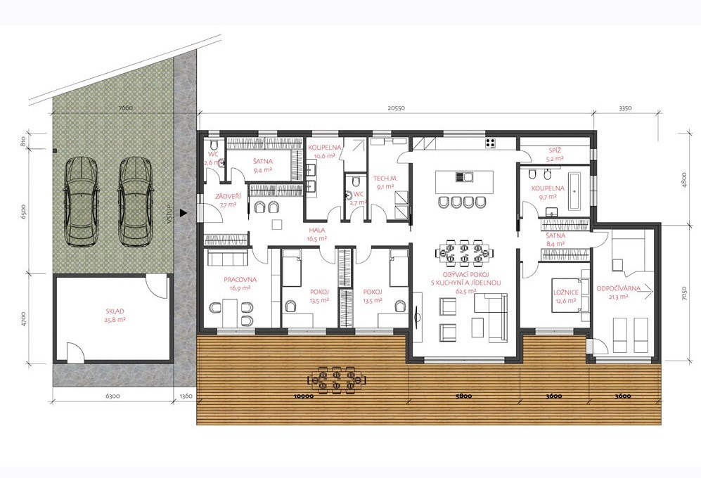 V jednopodlažním domě o dispozici 5 + kk, který bez problémů pojme i početnější rodinu, nechybí nic z toho, co dnes považujeme za nezbytné k nadstandardnímu bydlení: je zde kryté parkovací stání pro dva vozy, sklad zahradní