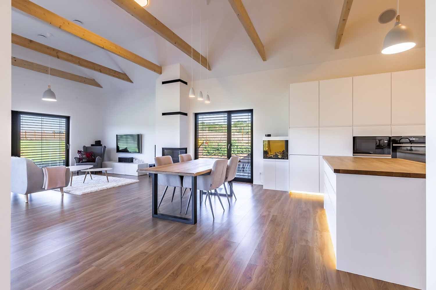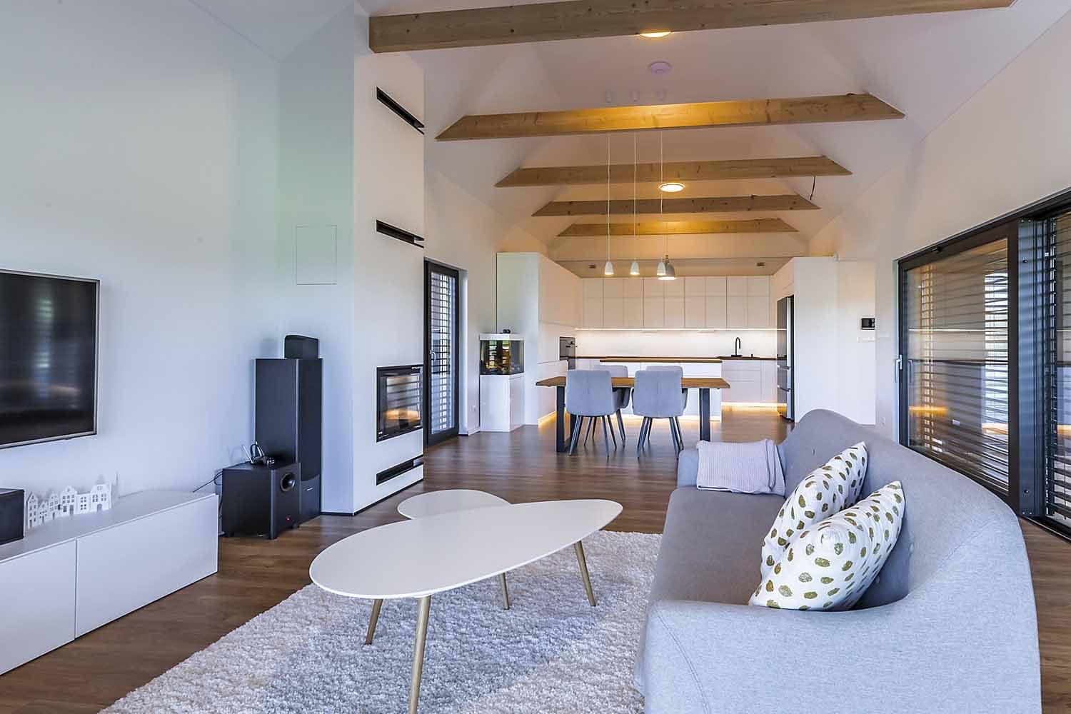 Dům se skládá ze dvou částí – v přízemí je to obytná část a v patře se nachází klidová část s ložnicí rodičů, dvěma dětskými pokoji a koupelnou. Také zde najdeme terasu, na kterou je možnost vejít jak z ložnice rodičů, tak i z obou dětských pokojů. V obytné části najdeme velký obývací prostor s bílým kuchyňským koutem a jídelnou, který je vzdušný a světlý díky otevření do krovu po celé této části.